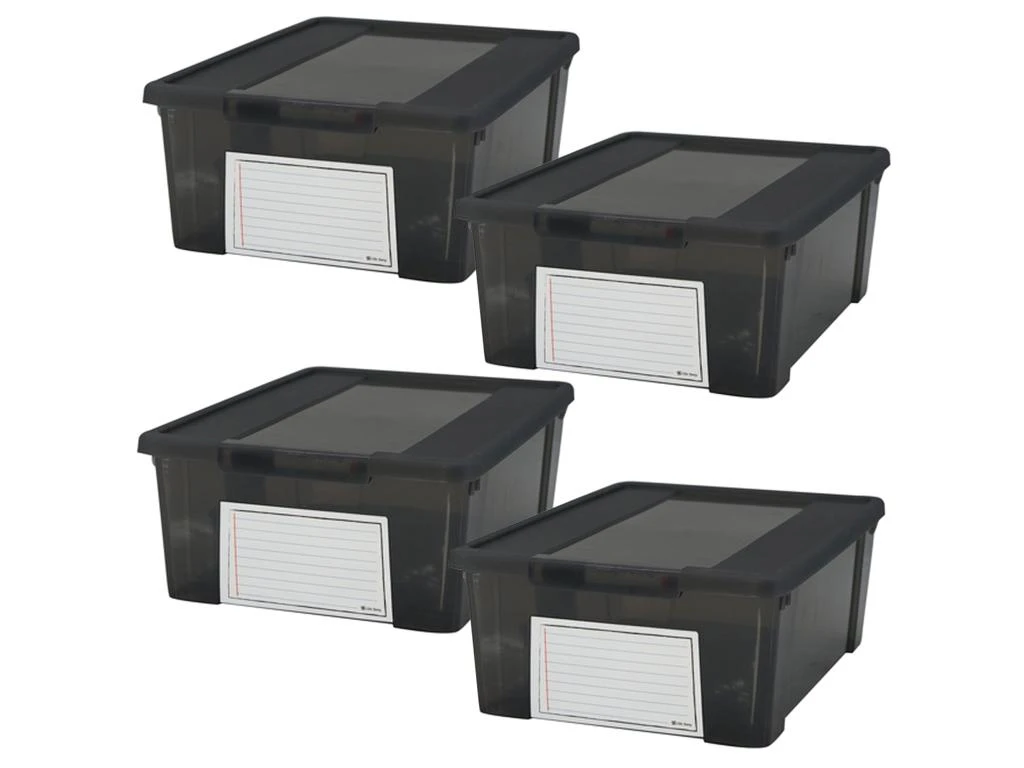 La boîte de stockage est fabriquée en plastique transparent (dans ce cas, sombre) qui vous permet de voir son contenu