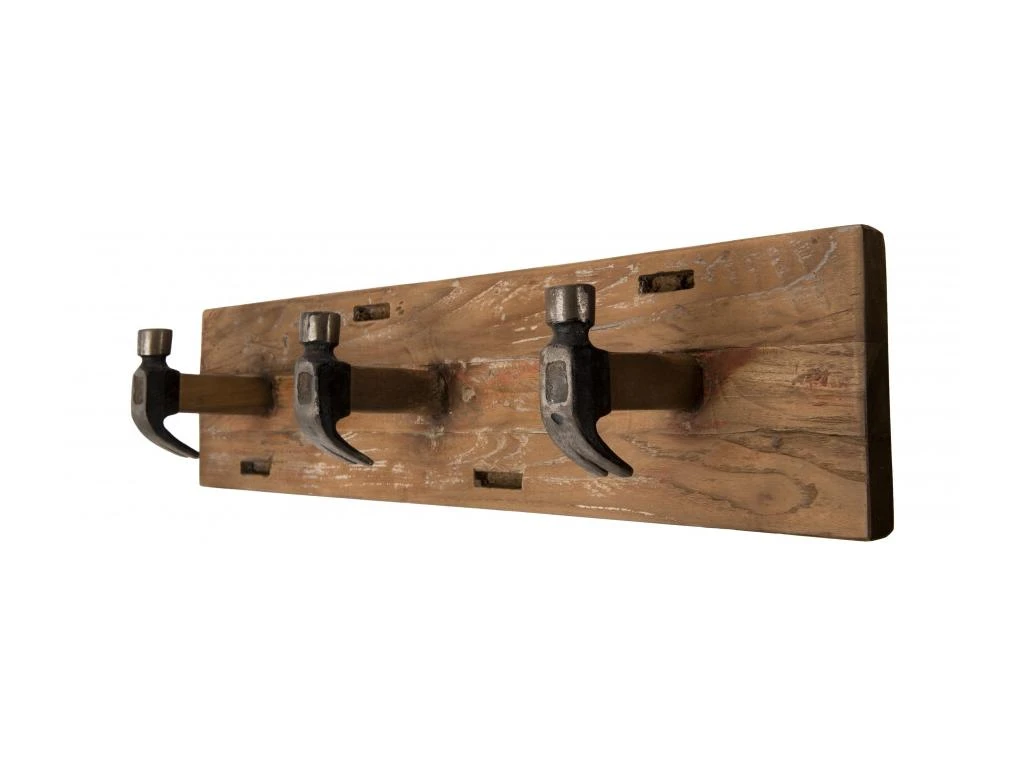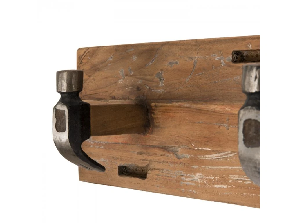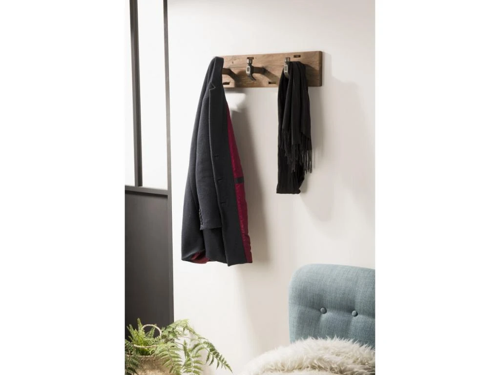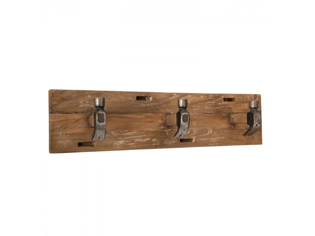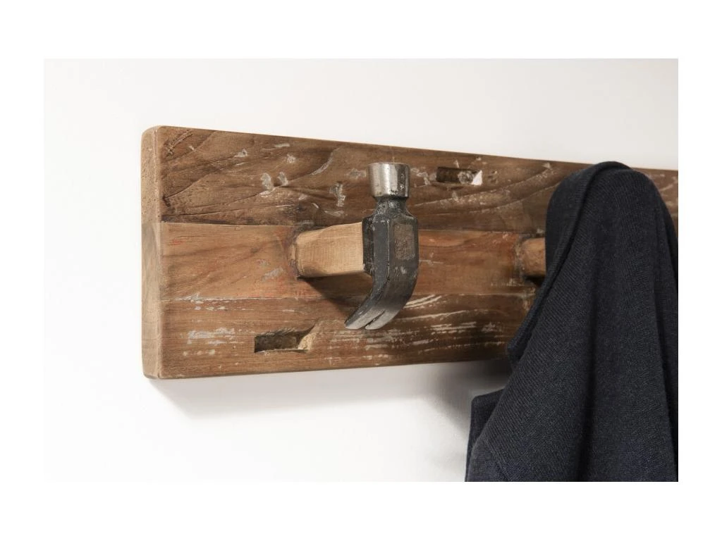 Portemanteau mural marron 3 crochets marteaux teck recyclé et métal. Dimensions : 60 x 13 x 15 cm. Article en Teck recyclé et Métal. Cet article est composé de bois recyclé ! Le bois recyclé est un bois récupéré de vieilles charpentes, de coques de bateaux ou tout bois de récupération ayant déjà eu une longue vie. C’est ce qui lui donne cet aspect vieilli et authentique avec ses imperfections qui font tout son charme. Acquérir du bois recyclé est une initiative écoresponsable qui permet de lutter contre la déforestation.