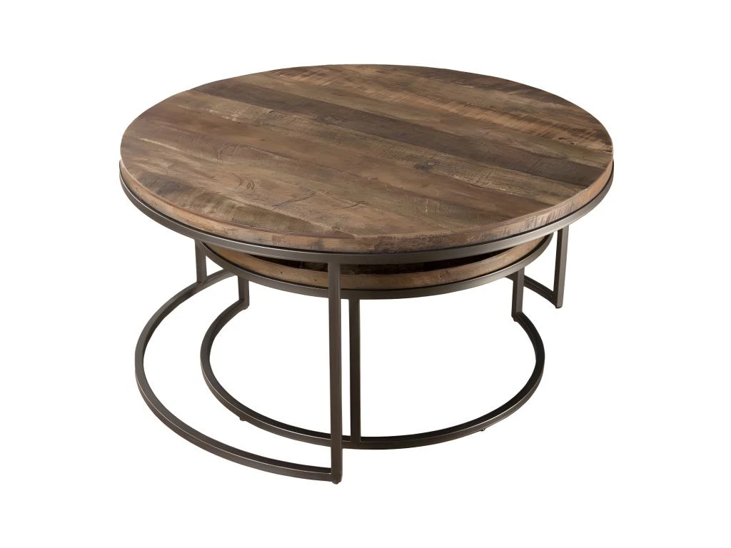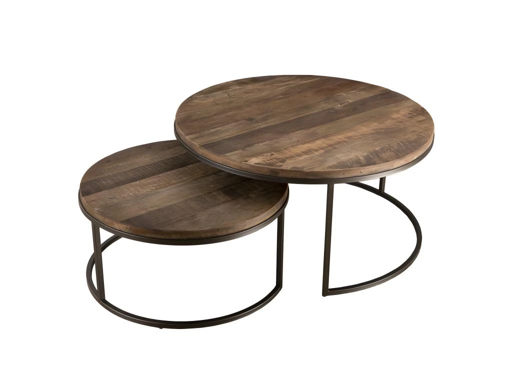Set de 2 tables basses gigognes rondes Teck recyclé Acacia Mahogany recyclé pieds métal noir. Dimensions : 80 x 80 x 40,5 cm. Article en Teck recyclé et Acacia, Mahogany recyclé. Cet article est composé de bois recyclé ! Le bois recyclé est un bois récupéré de vieilles charpentes, de coques de bateaux ou tout bois de récupération ayant déjà eu une longue vie. C’est ce qui lui donne cet aspect vieilli et authentique avec ses imperfections qui font tout son charme. Acquérir du bois recyclé est une initiative écoresponsable qui permet de lutter contre la déforestation.