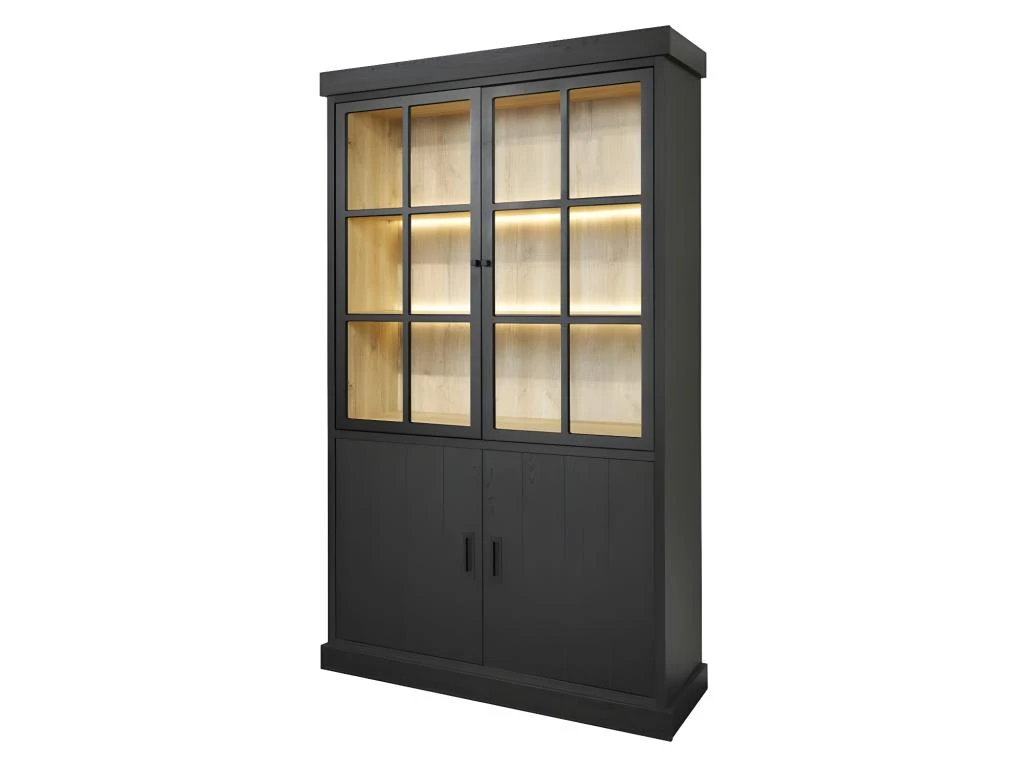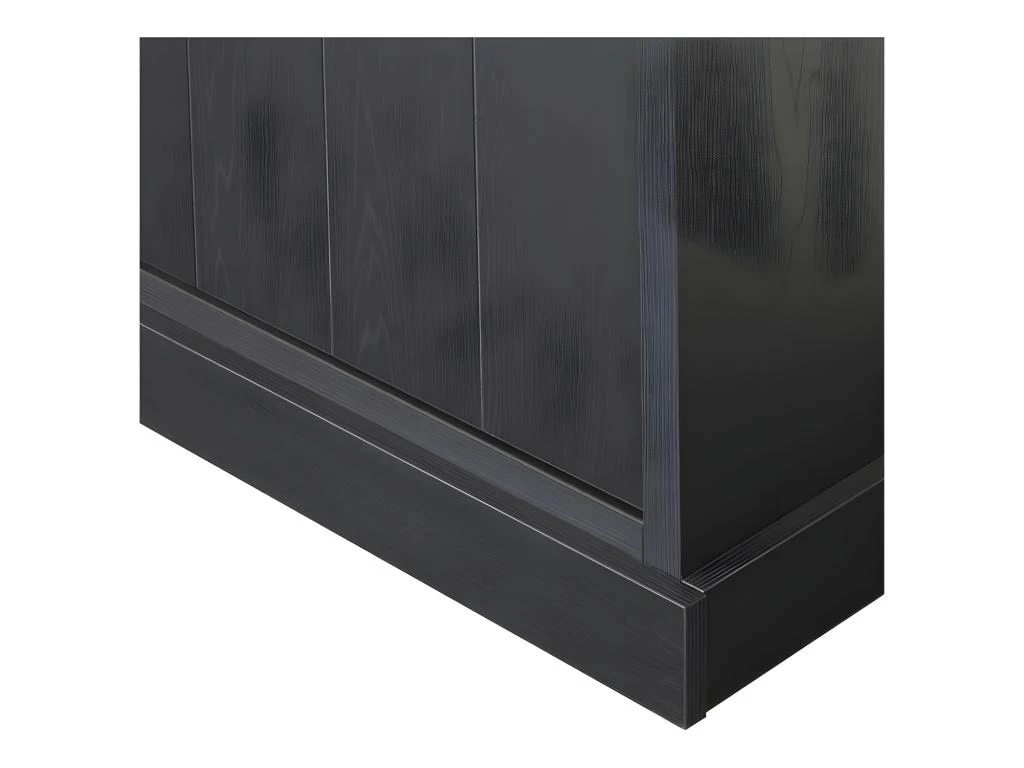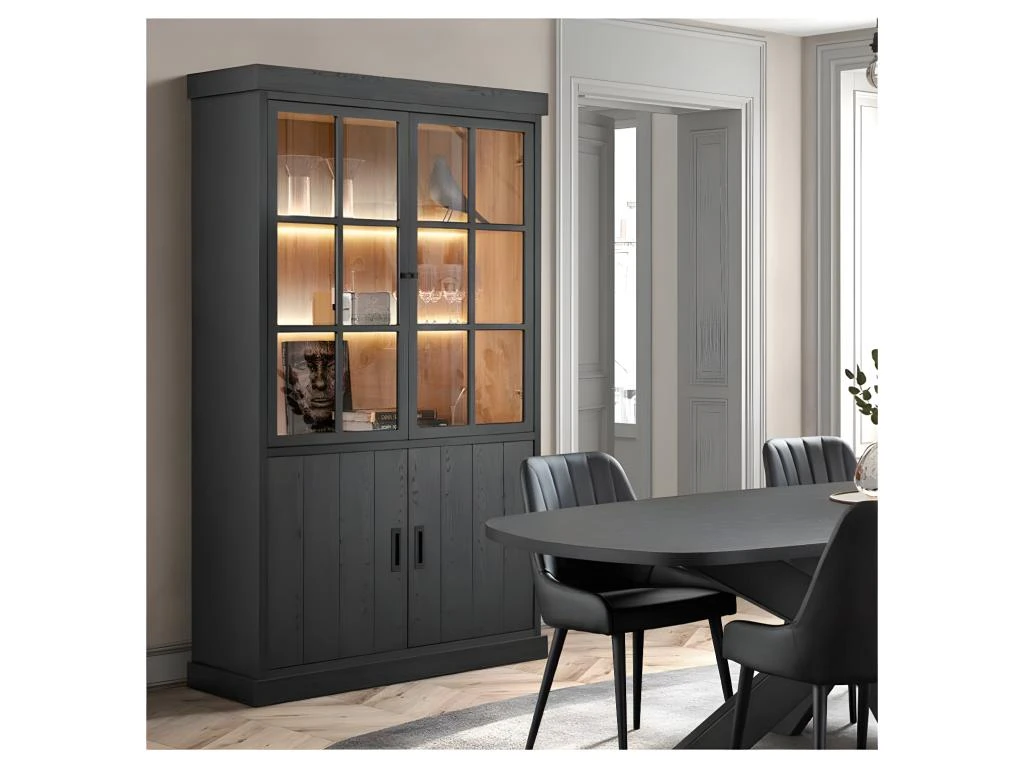 Combinant une finition bois noir au rendu plus vrai que nature et des éléments façon métal (portes du haut) cette majestueuse armoire de salon saura être intégrée au code couleur de votre pièce.