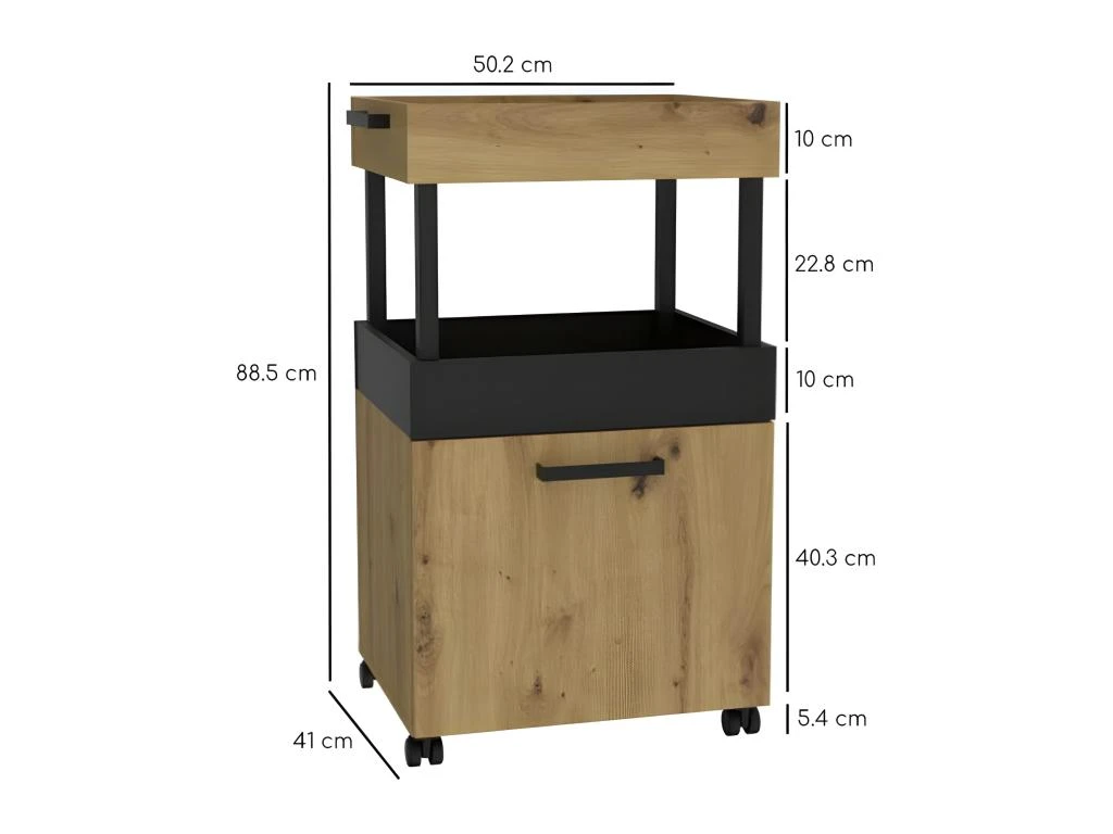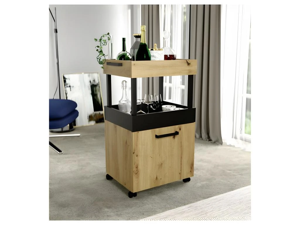 Passez de très bonnes soirées apéritives aux côtés de ce meuble bar. Vous pourrez le déplacer facilement grâce à ses poignées du haut et à ses roulettes. Vous déposerez des bouteilles, des verres et des gâteaux apéritifs dans son placard et sur ses plateaux. Vous pourrez le stabiliser avec les freins bloque-roue. Mettez-les dans un salon, dans une salle à manger ou dans une cuisine. Vous rajouterez une petite note rustique à votre intérieur. Alors optez pour son côté pratique et son design !