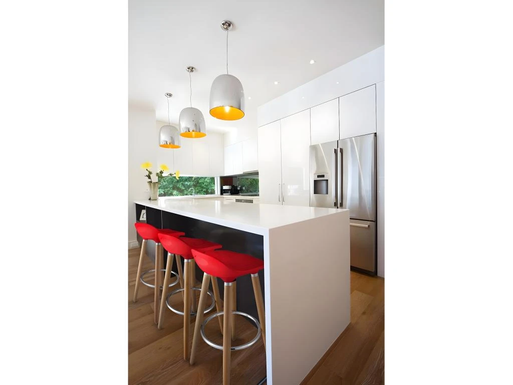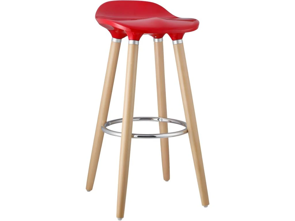 Piétement en métal, finition aspect bois. Repose-pieds chromé. Assise en plastique ABS coloris rouge.