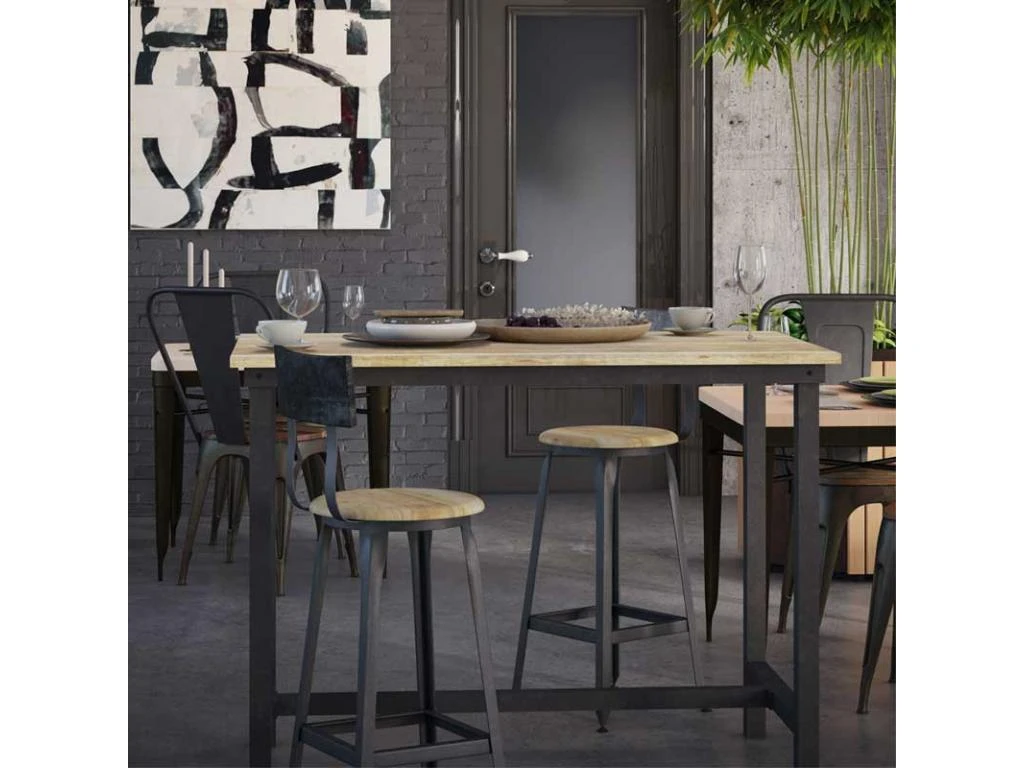 Tabouret de bar avec dossier style industriel Dimensions: L 34,5 x l 39 x H 104 cm Matière: Acier patiné et bois de manguier Dosseret d’appui Hauteur d’assise 75 cm Vernis nitrocellulosique Bois certifié FSC Assemblage: Livré monté – 7 kg