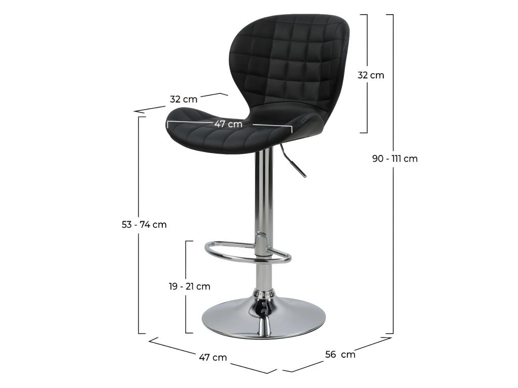 Grâce à ses dimensions généreuses L 47 x P 56 x H totale 90/111 cm, notre chaise de bar Mazzia (lot de 2) deviendra votre must pour accompagnera vos moments de détente. Vous apprécierez son siège pivotant et réglable en hauteur qui vous permettra de l’installer aisément.