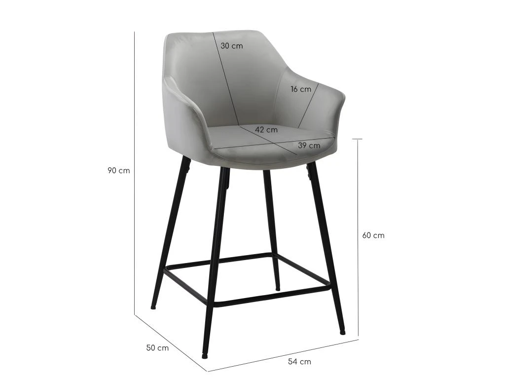 - DIMENSIONS GÉNÉRALES APPROXIMATIVES : hauteur 90 cm x largeur 54 cm x profondeur 50 cm. Hauteur d’assise 60 cm x largeur d’assise 39 cm x profondeur d’assise 42 cm. Hauteur du dossier 30 cm. Hauteur des accoudoirs 16 cm.