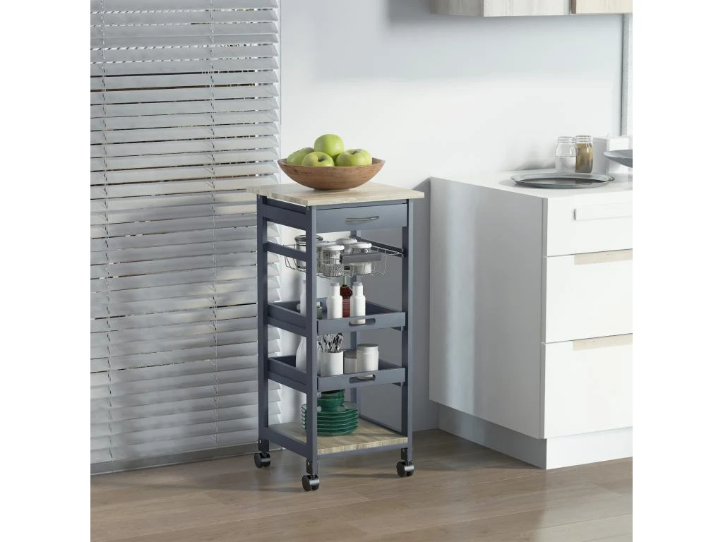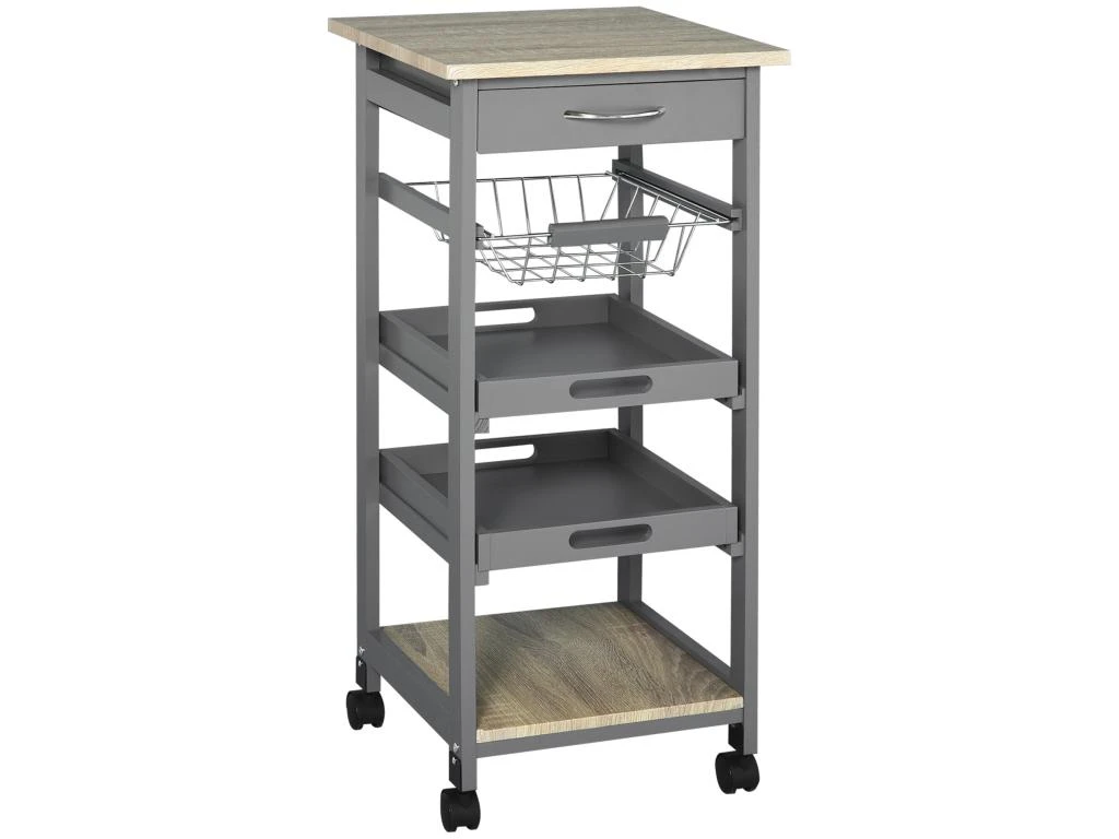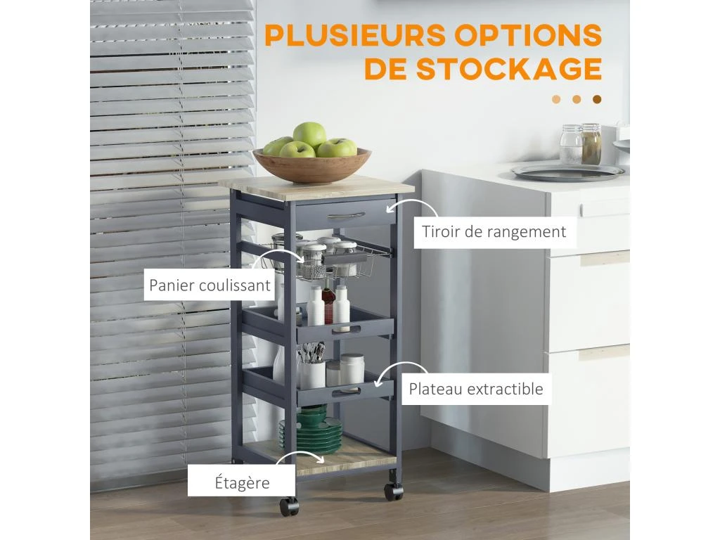 – Desserte multi-rangements : panier + 2 plateaux amovibles, tiroir, étagère + plateau supérieur/plan de travail