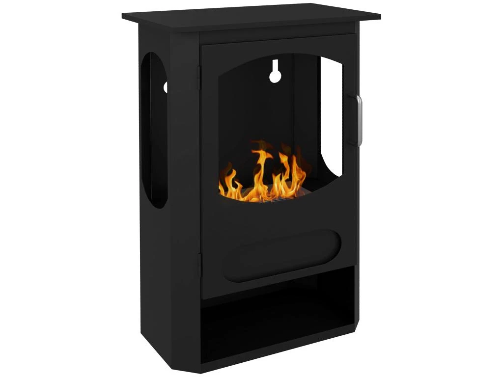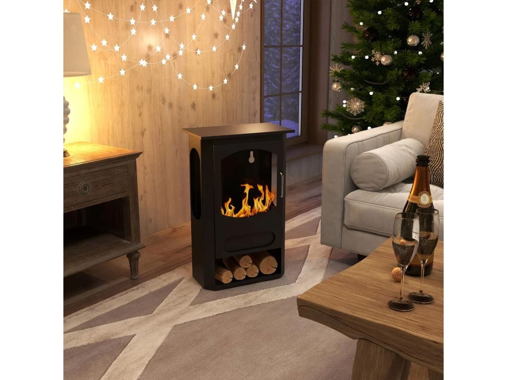 – Cheminée bioéthanol style contemporain noir uni avec avec range-bûches intégré, idéale à installer dans la pièce de votre choix : salon, etc.