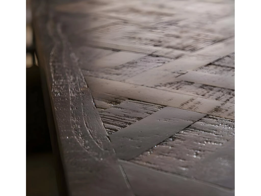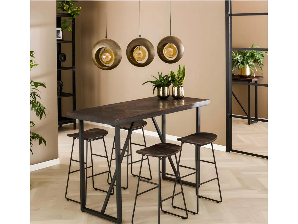 Cette table de bar tendance ‘Chevron’ est fabriquée en teck vernis en brun. Le plateau de la table est incrusté d’un motif de bois « Versailles » qui lui donne un très bel aspect. deux chaises de bar peuvent être placées de chaque côté.