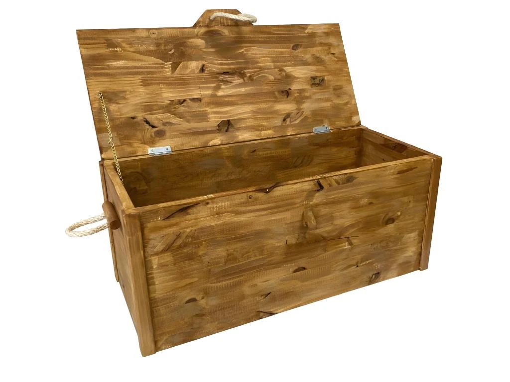 Coffre en bois de pin Fait main, marron teinté teck Bois de pin Poignées en bois et corde Dim : 32 x 34 x 79 cm (dimensions prises avec les poignets)