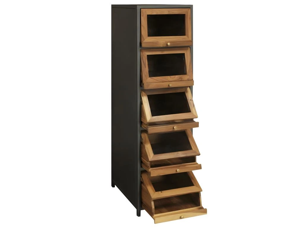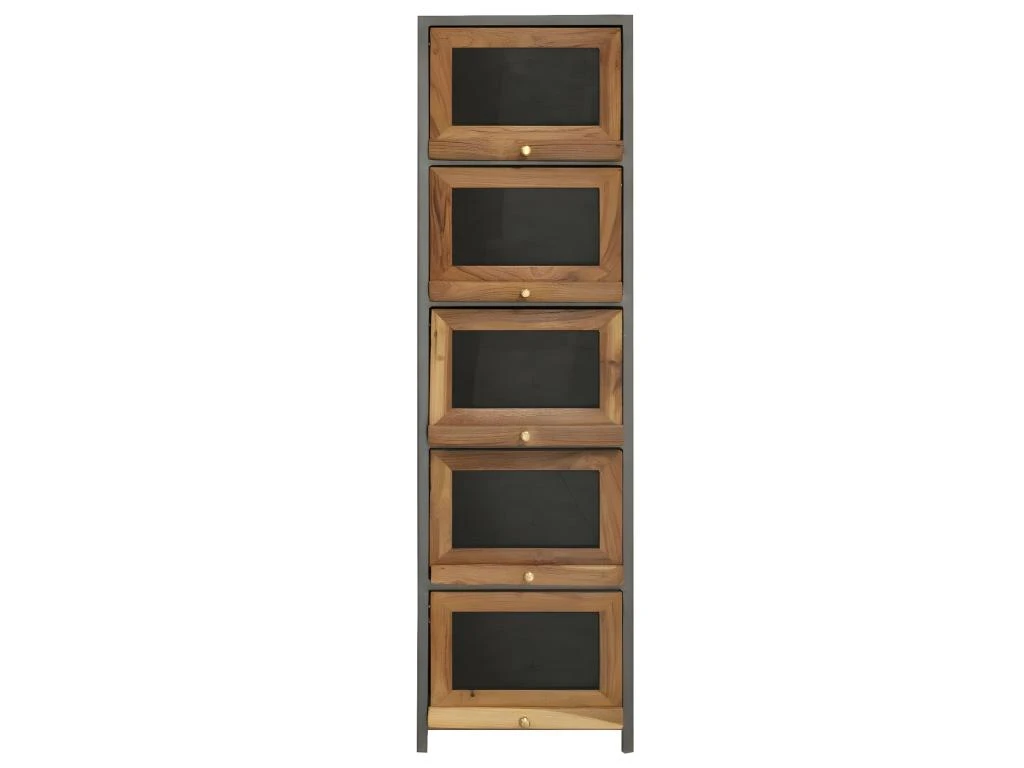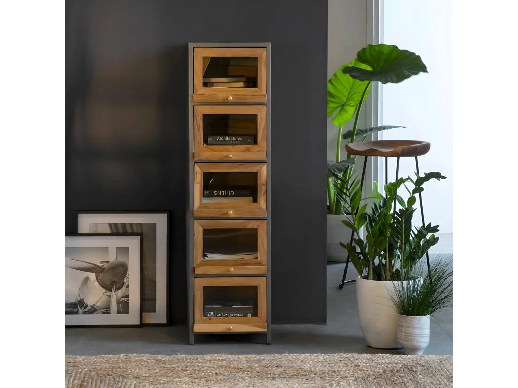 Découvrez cette superbe colonne au style définitivement industriel, elle a été réalisée à partir de matériaux de qualité à savoir le bois de teck et le métal gris foncé qui donne du caractère à l’ensemble du meuble. Dotée de 5 tiroirs vitrés elle vous permettra de rester organisé de manière optimale.