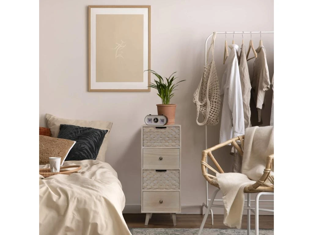 – ÉCONOMIE D’ESPACE ET ÉLÉGANCE : La commode convient également aux espaces limités et ses 4 tiroirs vous permettent d’organiser votre intérieur de manière élégante. Le mélange de style boho chic et scandinave offre une solution design pour meubler n’importe quelle pièce.