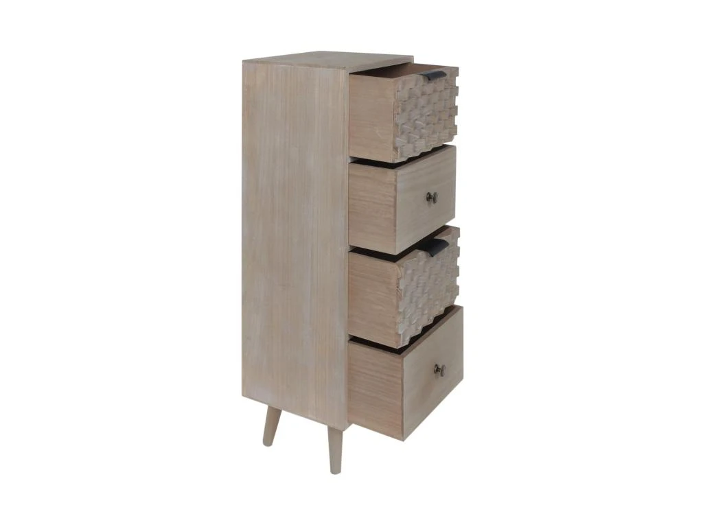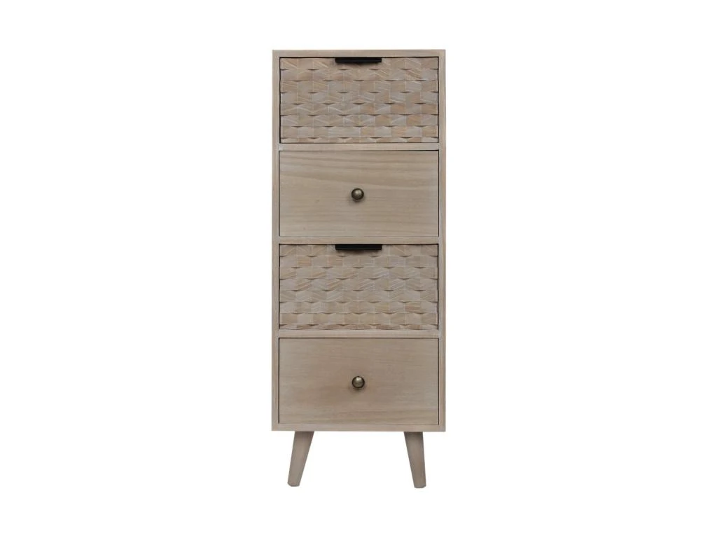 – SPÉCIFICATIONS : Dimensions : H 79 x L 30 x P 25 cm – Tiroirs (4) : H 14,5 x L 25,5 x P 21 cm – Hauteur des pieds : 11 cm – Couleur : Marron – Matière : Paulownia, Pin – Pieds à assembler, instructions incluses – Code RE6857