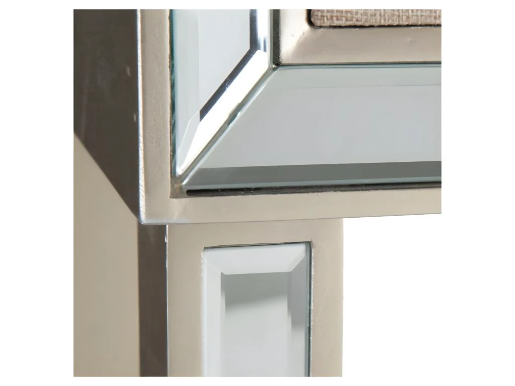 Les ouvrants habillés de tissu sont mis en valeur par le corps en bois teinte crème, des incrustations de miroir apportent de l’originalité et augmentent le potentiel décoratif pour une signature visuelle unique en son genre.