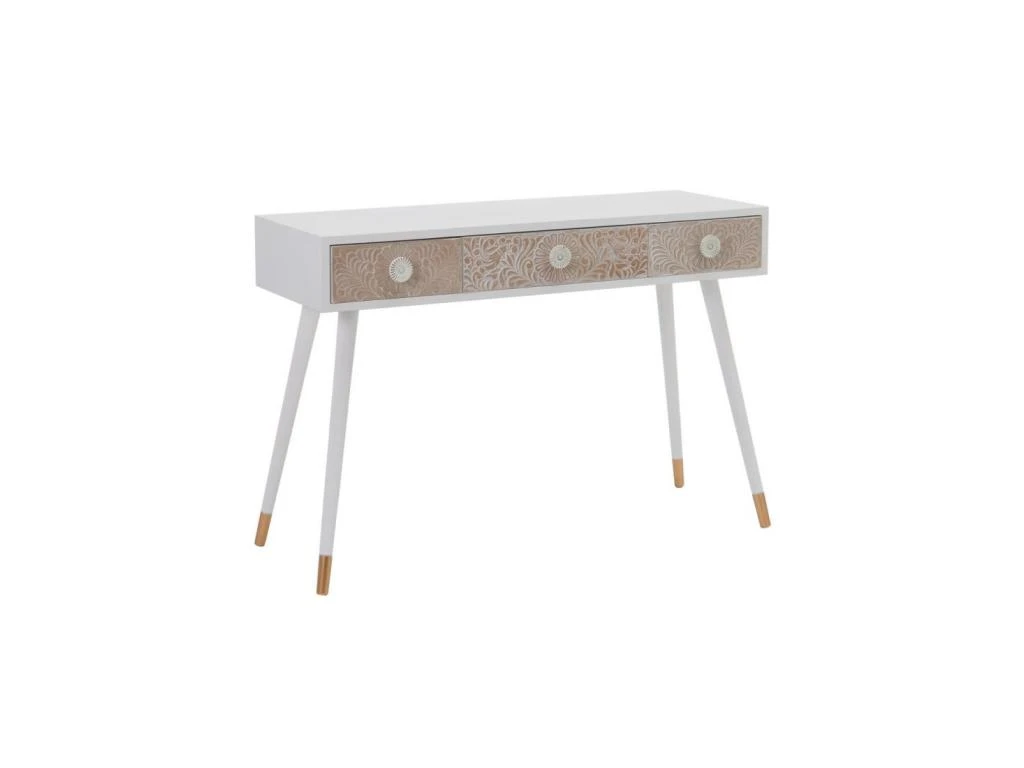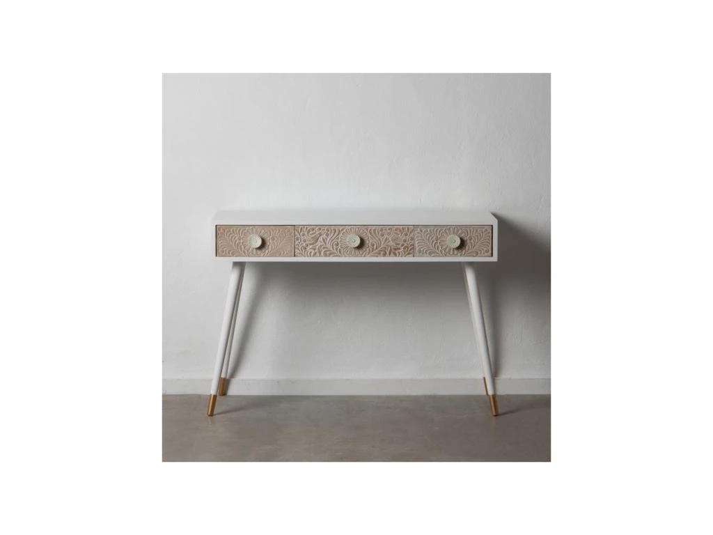 Pour une belle qualité perçue et un grand portentiel décoratif ce meuble d’appoint met en avant des tiroirs en bois massif de Pin teinte naturelle où les sculptures sont mises en volume par une céruse blanche appliquée dans les creux.