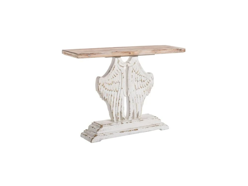 L’inspiration Baroque de cette console commande la mise en avant de belles sculptures ailes d’ange, cette inspiration de style est complétée par un mariage de bois teinté Blanc et de bois teinte naturelle caractéristique du style campagne chic.