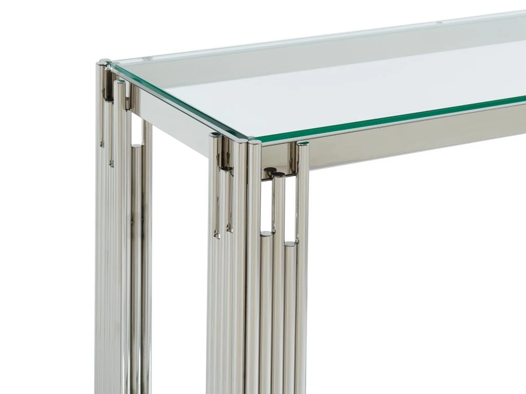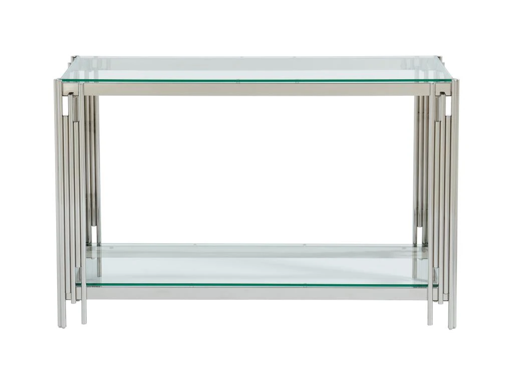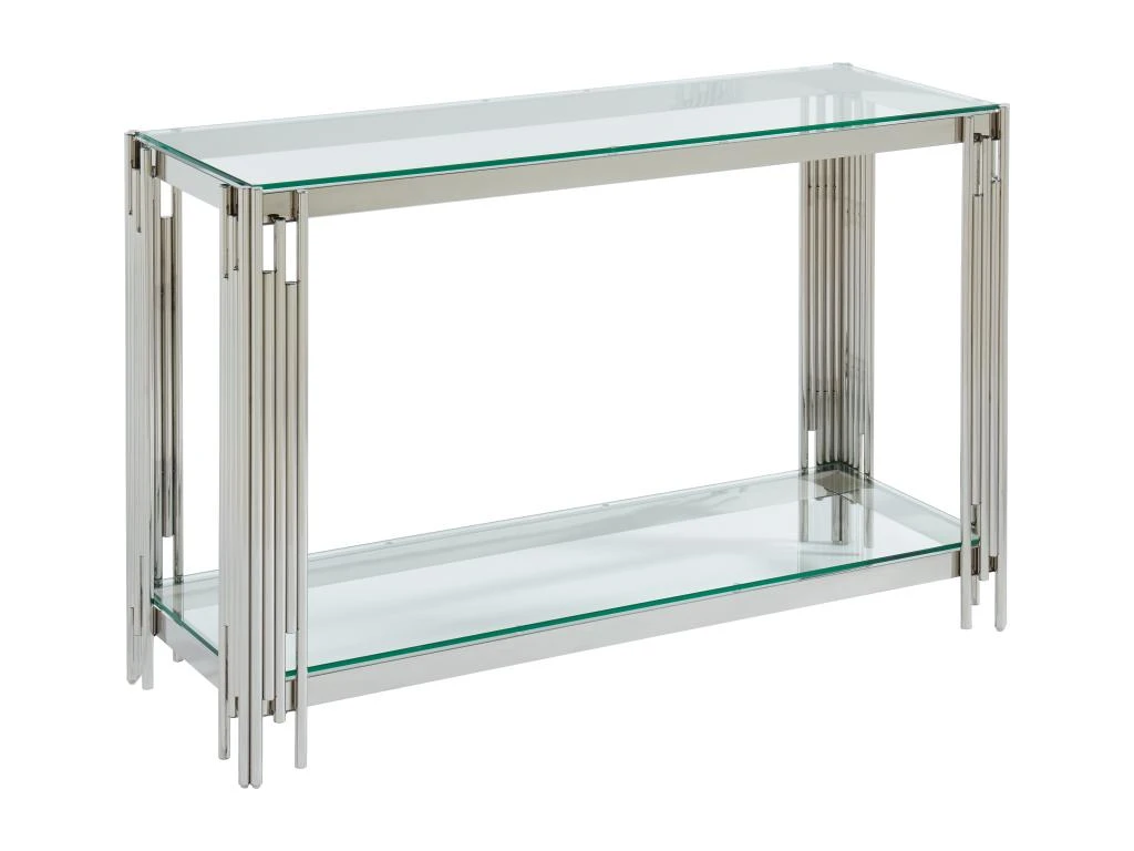 La console NOMELANO dispose d’un double plateau en verre trempé entouré d’une structure élégante et d’un piètement en acier inoxydable. Elle est un support solide pour les éléments de décoration que vous y déposerez.