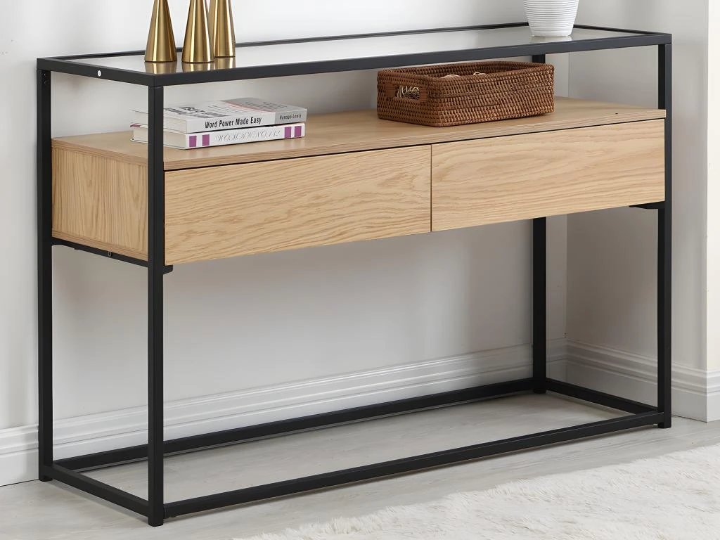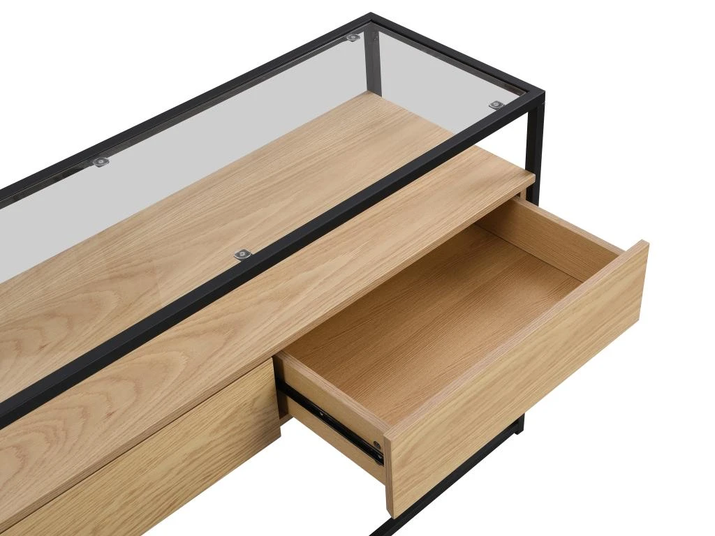 A la fois pratique aves ses multiples rangements et esthétique avec son plateau en verre qui contraste avec son coloris naturel, la collection CAMATA est idéale pour organiser votre intérieur. Vous pourrez déposer des éléments de décoration entre le plateau en verre et le meuble lui-même et ainsi donner un esprit unique aux produits de cette collection. Associez-le à des tons naturels et neutres comme du beige et du blanc pour une harmonie parfaite !
