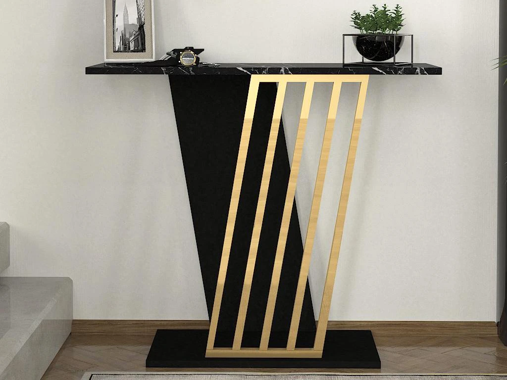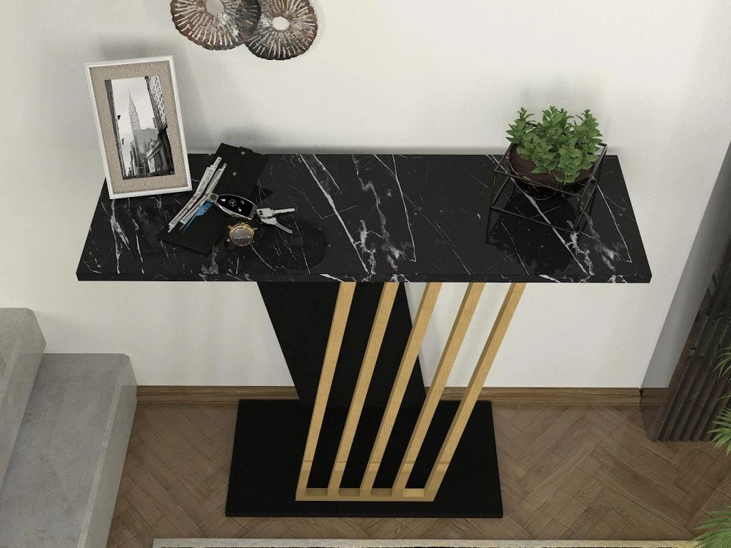 La console ORSONA se remarque pour son raffinement. Avec son plateau effet marbre noir et l’ornement décoratif doré qui se trouve au niveau de son piètement, elle est le meuble élégant qui réhaussera le style de votre entrée.