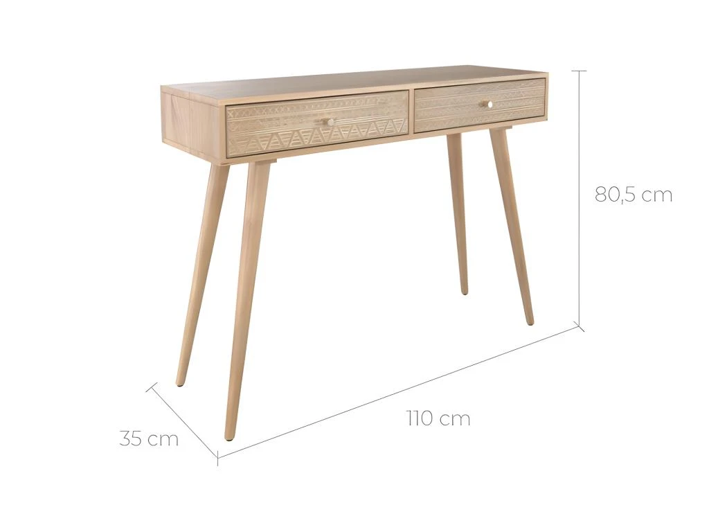 Si vous aimez les atmosphères où le chic s’invite, vous allez adorer la console Tiny. Cette pièce de mobilier s’impose par son design élégant et le raffinement de ses tiroirs gravés. L’ajout d’une patine blanchie apporte une note rustique qui convient aux styles de déco les plus variés. Dans une ambiance colorée ou un cadre plus neutre, elle va devenir un point phare d’une chambre. On l’imagine agrémentée de quelques objets déco ou surmontée d’un miroir.