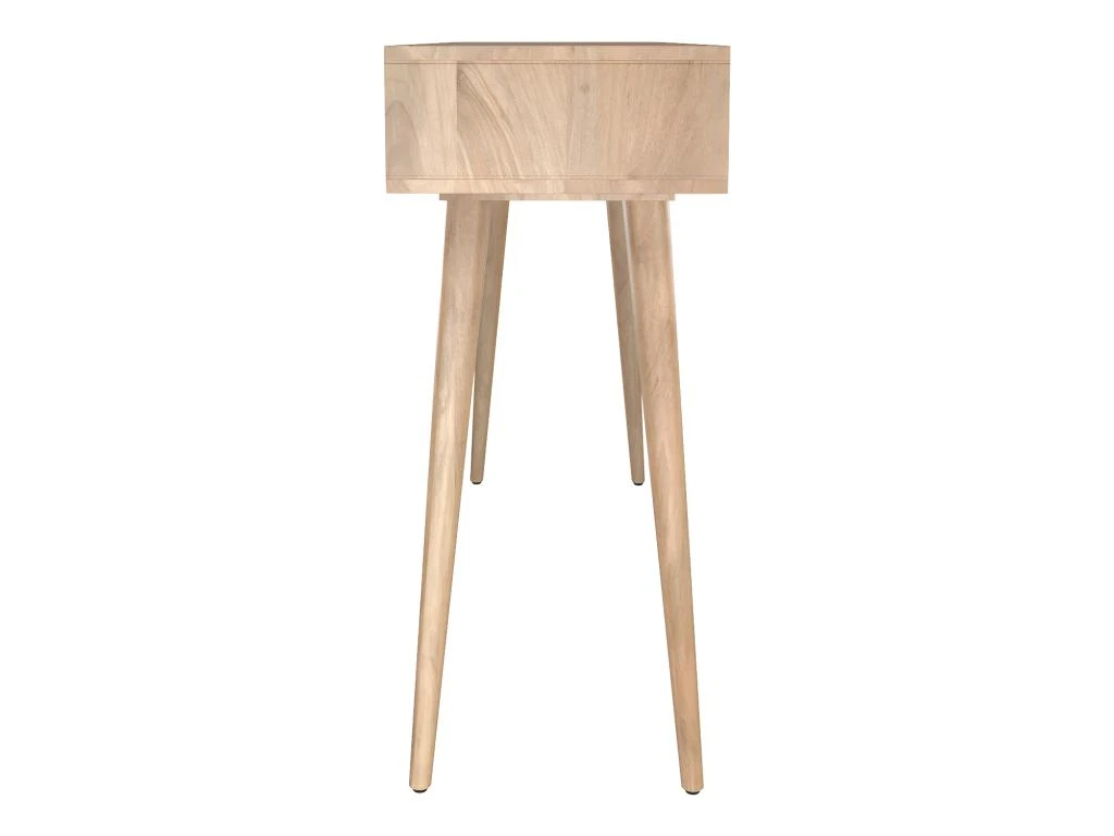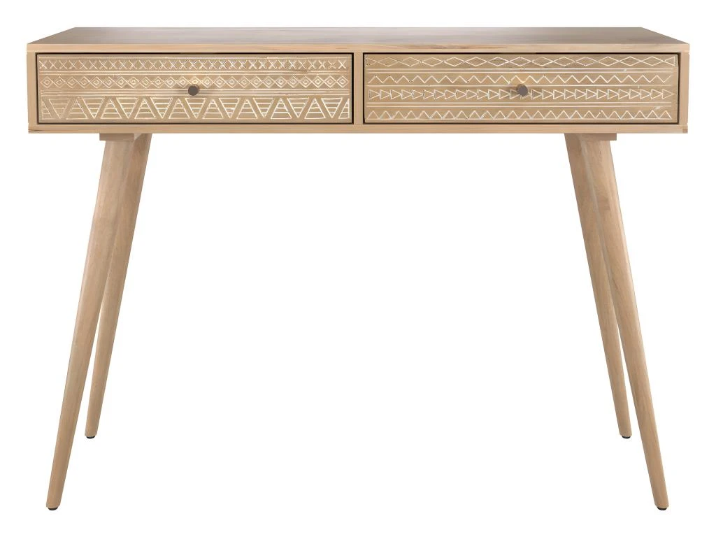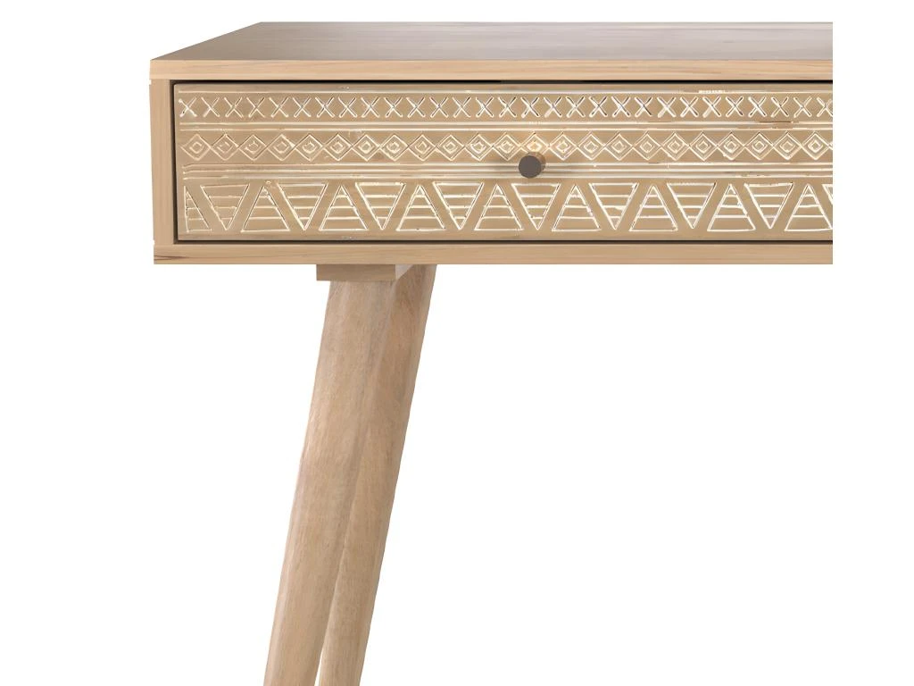 Le bois de manguier est une essence exotique dont les nuances sont particulièrement appréciées. Le mélange de teinte brute et de blanc fonctionne à merveille. Vous aimerez le travail effectué au niveau des tiroirs ornés de gravures délicates. Des poignées en métal argenté et des pieds légèrement inclinés viennent compléter l’allure de cette console.