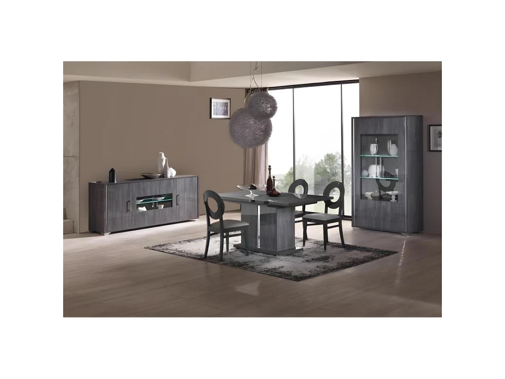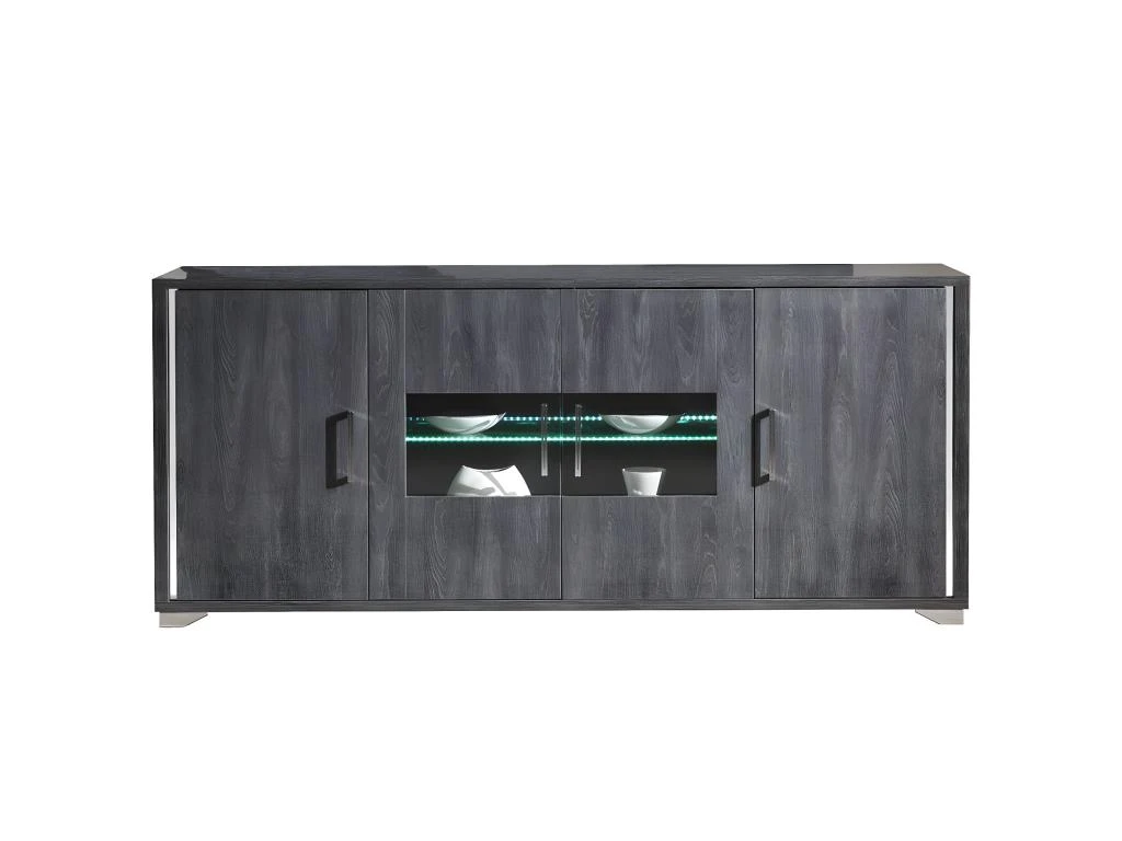 Grand buffet dont les 4 portes dissimulent de larges espaces pour entreposer vaisselle et autres accessoires. Les portes centrales sont vitrées, afin de pouvoir admirer les tablettes en verre sublimées par l’éclairage Led. A combiner avec les autres meubles de la gamme Daisy.