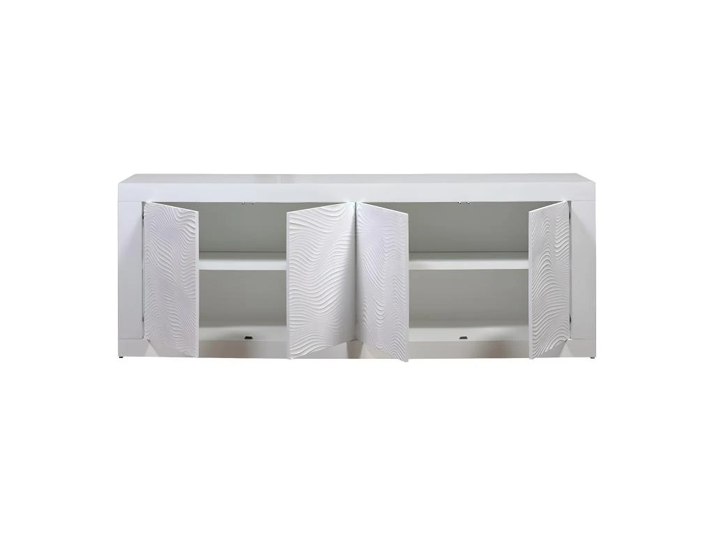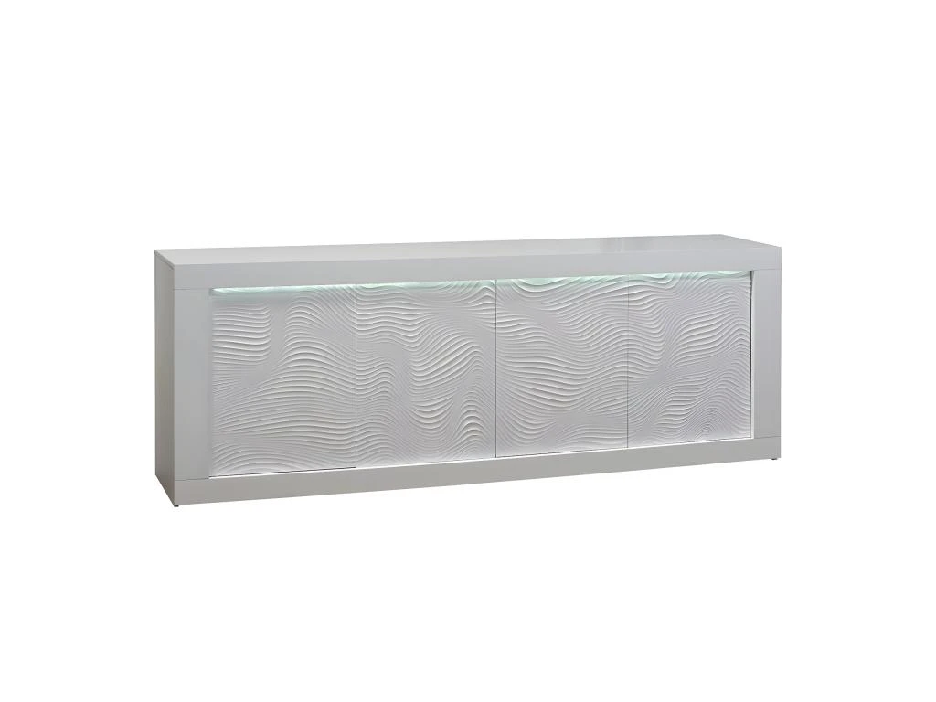 MADE IN FRANCE : Buffet 4 Portes Laqué Blanc de la gamme Dayton White, façades avec reliefs ondulés et Eclairage Led inclus.