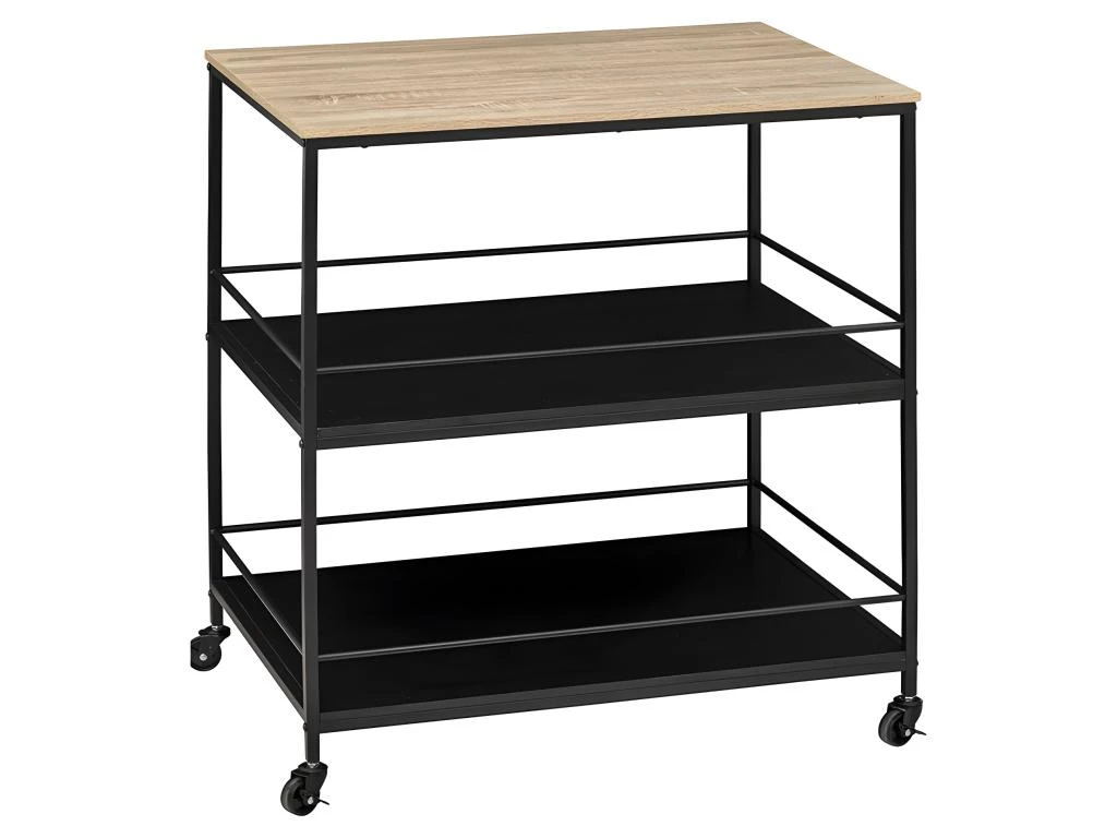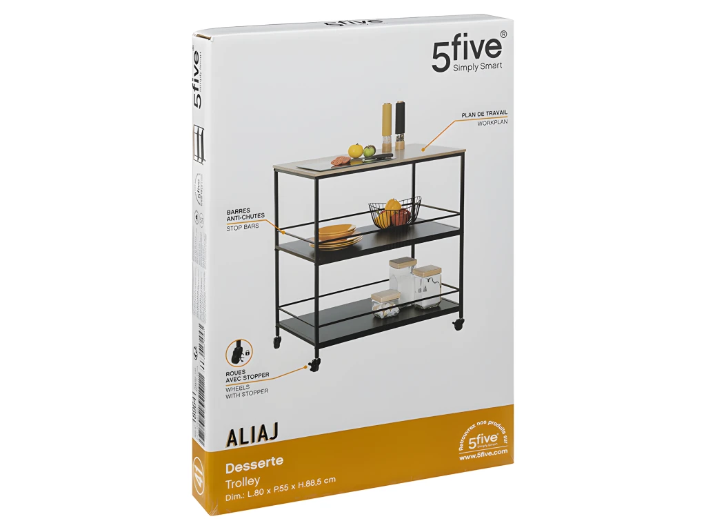 Intemporelle, pratique et passe-partout, découvrez la grande desserte en métal et bois Aliaj de la marque 5five. La desserte dispose de roulettes avec stopper pour plus de stabilité. Ses 2 niveaux inférieurs disposent de barres anti-chutes. Hauteur entre chaque étagère : 35 cm. A monter soi même. Charge maximale plan de travail : 30 kg. Usage intérieur exclusivement. Dimensions : L. 80 x l. 55 x H. 88,5 cm. Poids : 15,28 kg. Matière : Fibres de bois MDF et métal. Marque : 5five.