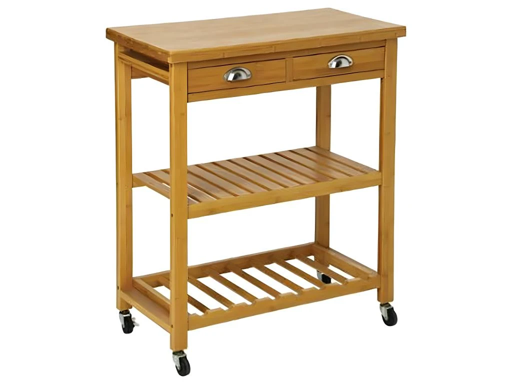 Le bambou est un matériau connu pour sa haute résistance à l’humidité. Cette desserte peut donc s’utiliser dans la salle de bain sans risque mais aussi dans la cuisine ou dans toute autre pièce o๠vous avez besoin de rangement d’appoint ou de servir et desservir la table. Desserte composée d’un plateau supérieur avec 2 tiroirs et 2 clayettes. En 100% bambou. Peinture finition vernis nitrocellulosique.4 roulettes pivotantes en plastique et métal chromé. Poignées en métal chromé. Livrée en kit, à monter soi-même, notice fournie. Hauteur – 90cm, Profondeur – 37cm, Largeur – 74cm.