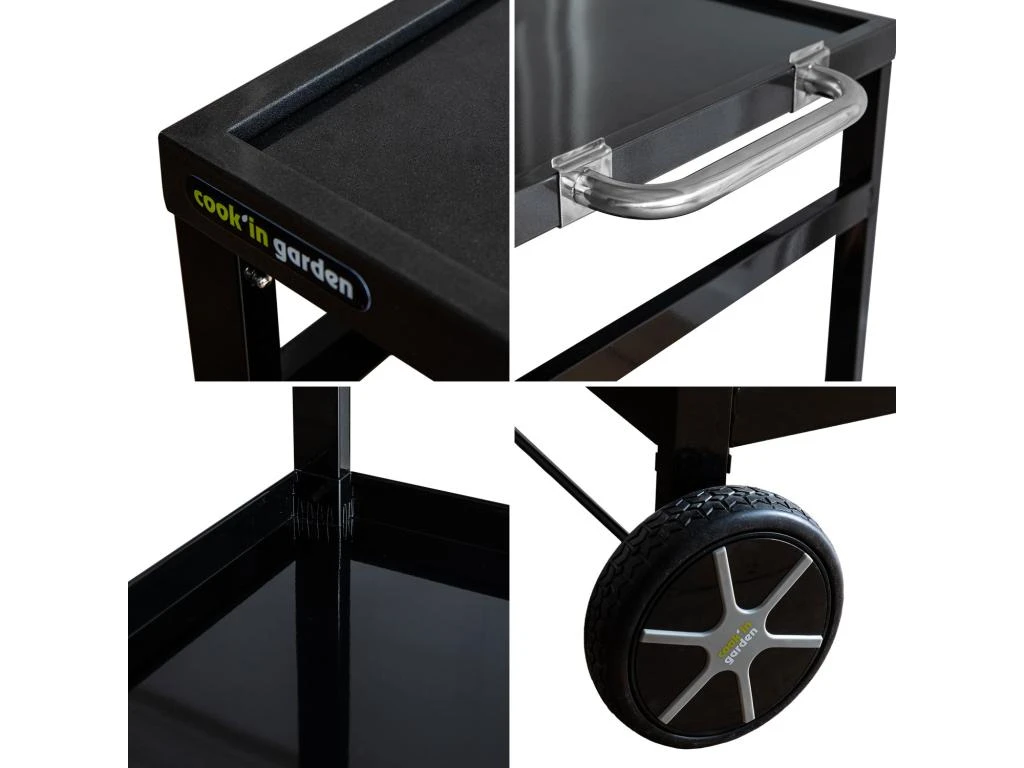 Cuisinez sur votre terrasse ou dans votre jardin en étant proche de vos invités grâce à ce chariot pour plancha. Il vous permet d’amener les ustensiles, la vaisselle et les aliments de votre cuisine à votre espace extérieur facilement grâce à ses deux roues et sa poignée. Ensuite, c’est à vous de jouer ! Disposez votre plancha sur le plateau haut et ce dont vous avez besoin pour cuisiner sur le plateau bas, qui comportent un rebord pour plus de sécurité. Cette desserte pour plancha est à monter en clipsant tous les éléments les uns aux autres. Vous n’avez besoin d’aucun outil et le montage se fait rapidement. Profitez de vos repas de l’été en famille et entre amis en plein air sur votre terrasse !