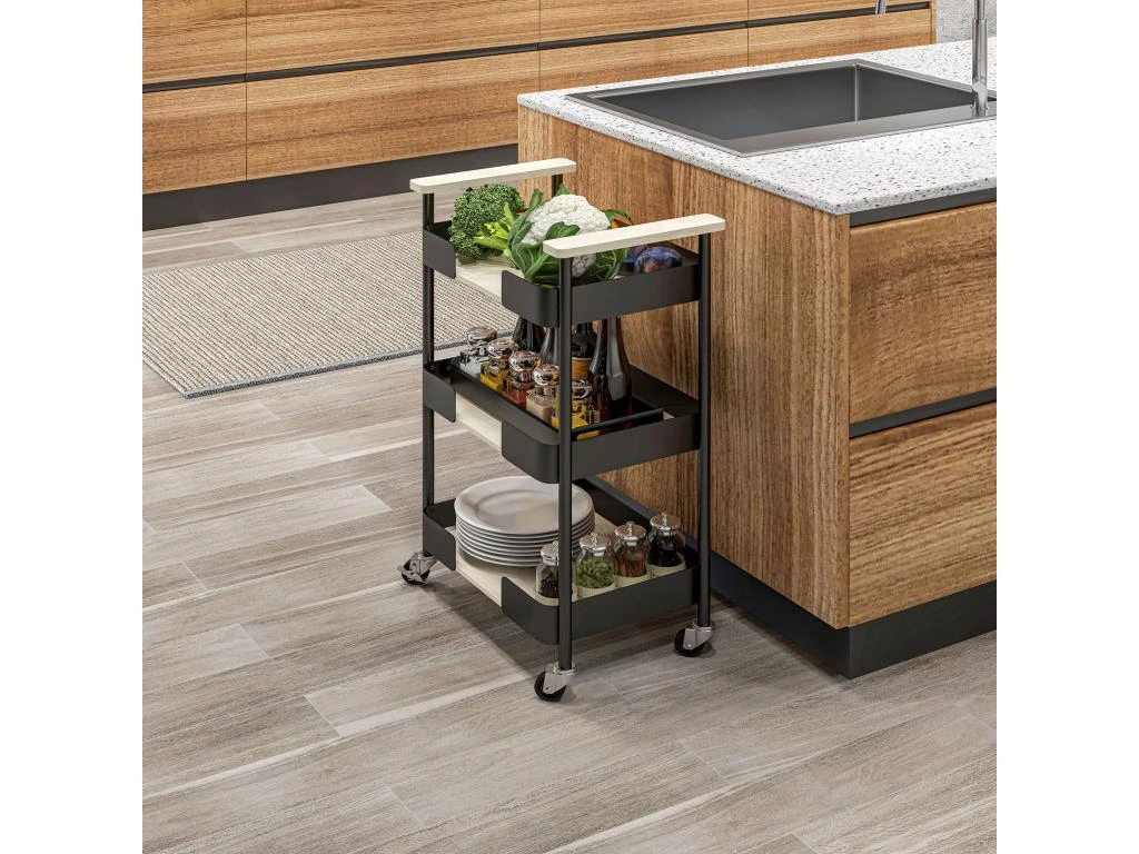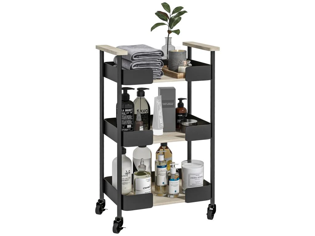 – Desserte multi-rangement : 3 étagères aspect bois clair avec rebord en métal noir , idéal pour ranger vos fruits, légumes et bien d’autres encore