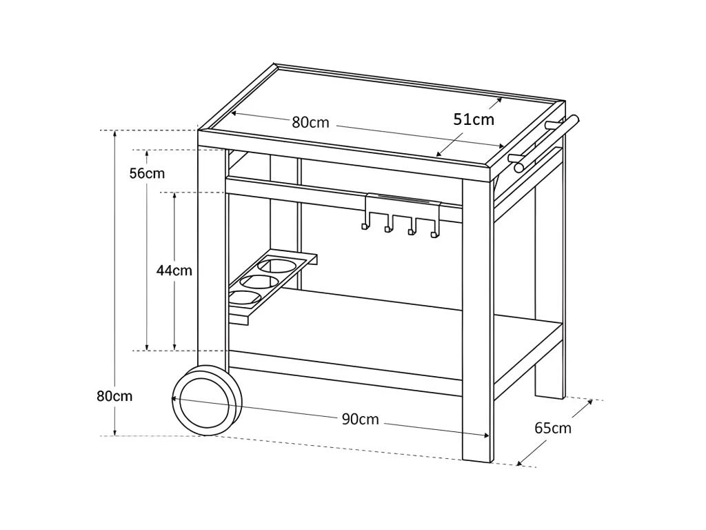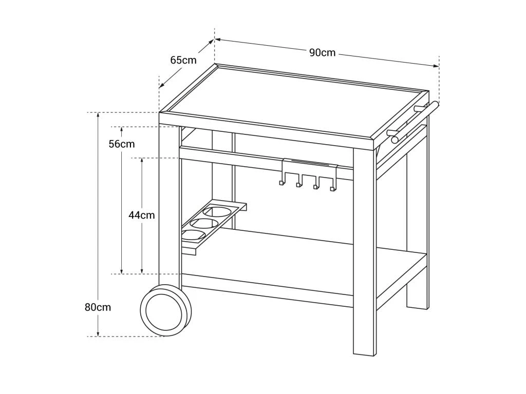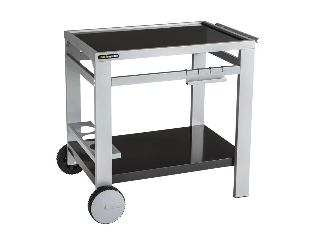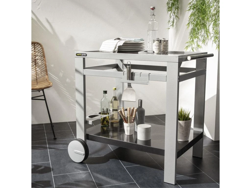 La desserte MEDIA M est conçue pour accueillir votre plancha, électrique ou au gaz, et tout votre équipement de cuisine d’extérieur. Elle est équipée de 4 crochets réversibles en porte-ustensiles et de 3 porte-bouteilles. Tout y est pour optimiser au maximum le rangement de vos aliments, plats et ustensiles. Elle possède également 2 roulettes et une poignée pour la déplacer facilement et sans risques à travers tout votre jardin.