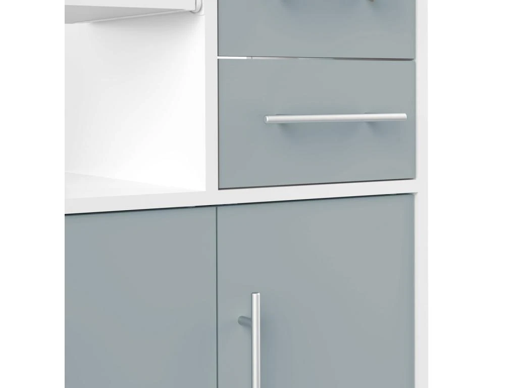 La desserte micro-ondes MARIUS à roulettes avec deux tiroirs, trois portes, une niche et une tablette coulissante.