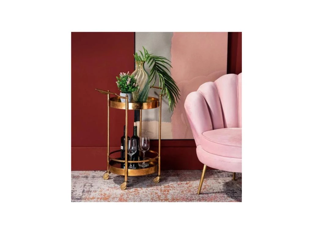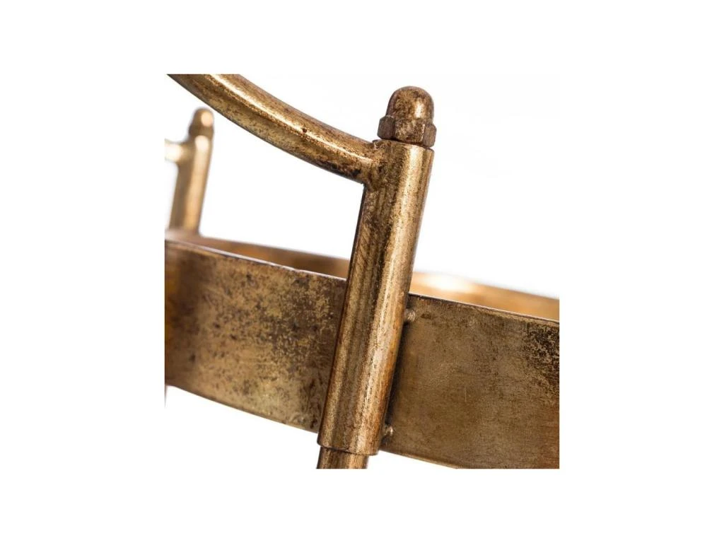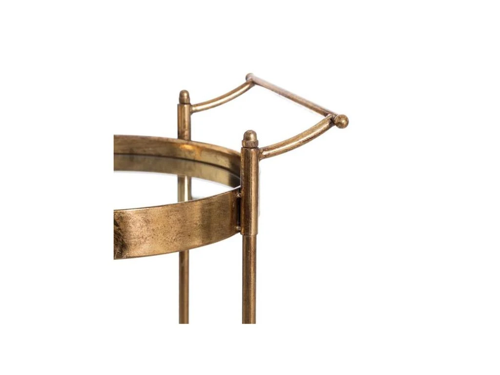 Bénéficiant d’un format original et d’une mise en teinte or patiné du plus bel effet, cette petite table à désservir est équipée de roulettes et de poignées pour un déplacement aisé.