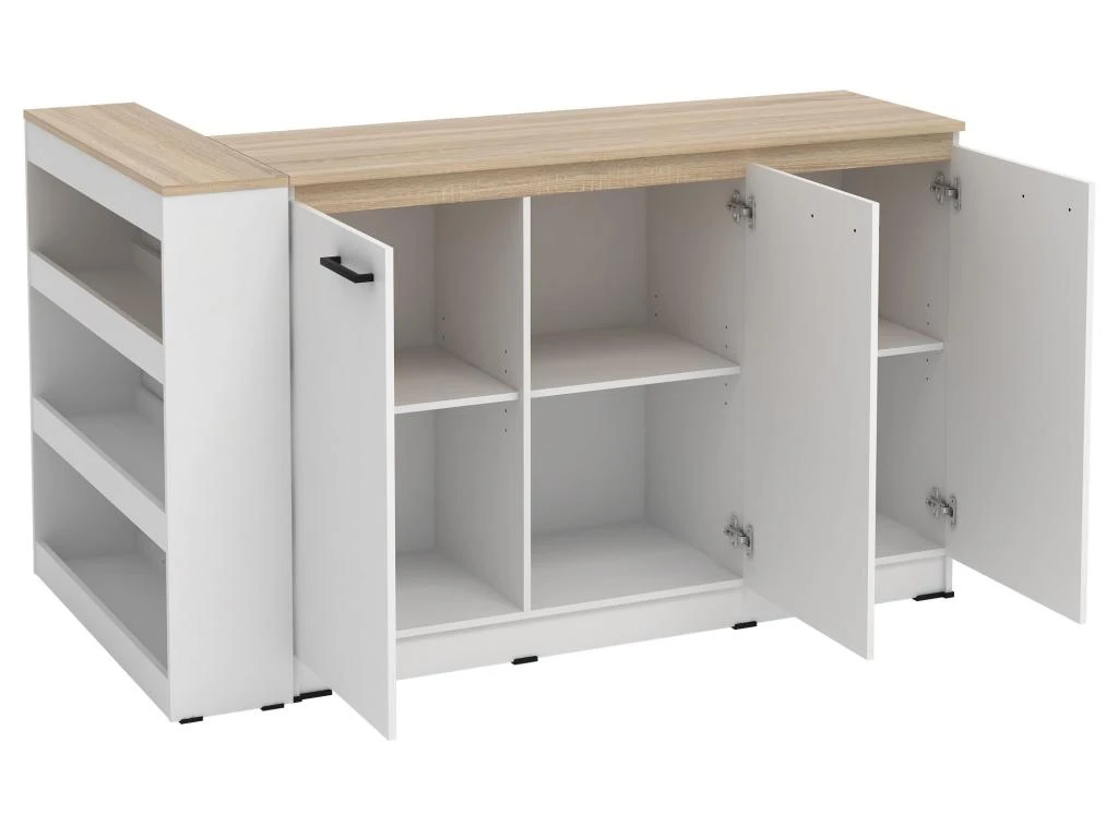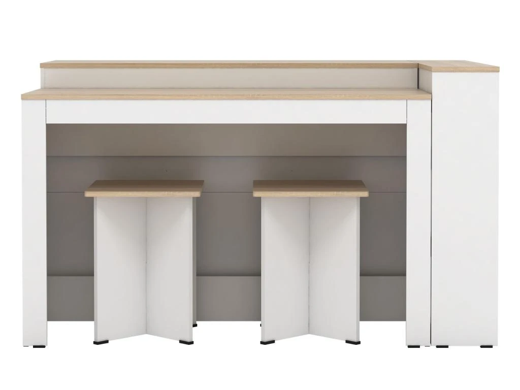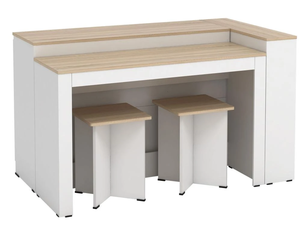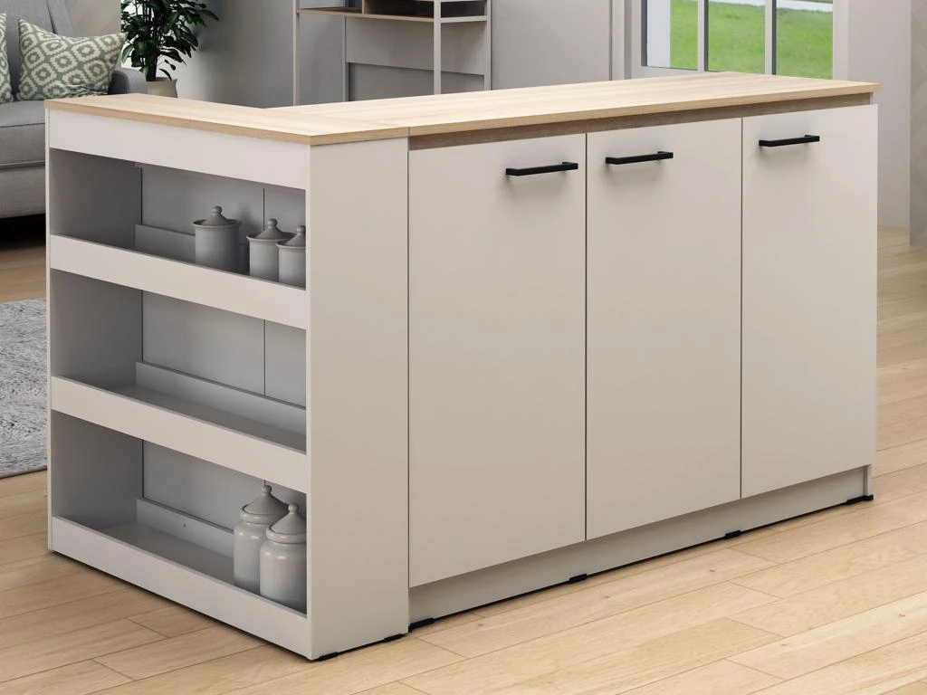 L’îlot central de cuisine NUSICE est le parfait équilibre entre fonctionnalité et convivialité. En effet, vous pourrez y cuisiner vos meilleurs plats tout en ayant le nécessaire à proximité, rangé derrière ses 3 portes ou sur ses étagères latérales. Et vous pourrez aussi y partager des moments avec vos proches grâce aux 2 tabourets assortis ! Enfin, son style contemporain et sobre saura parfaitement se fondre dans votre cuisine.