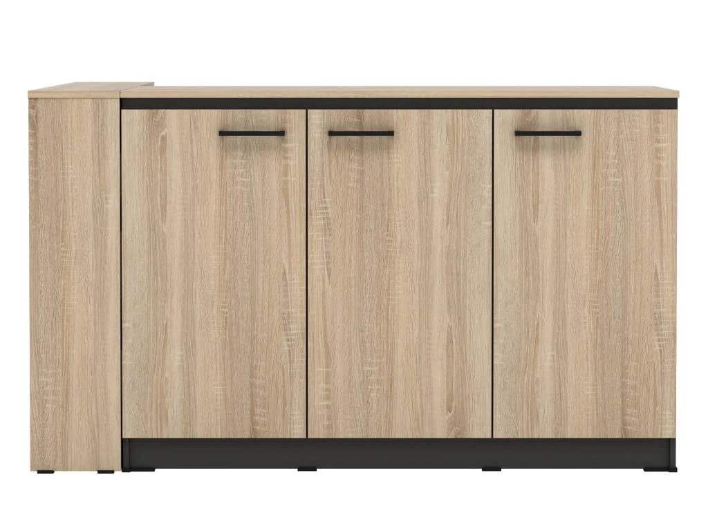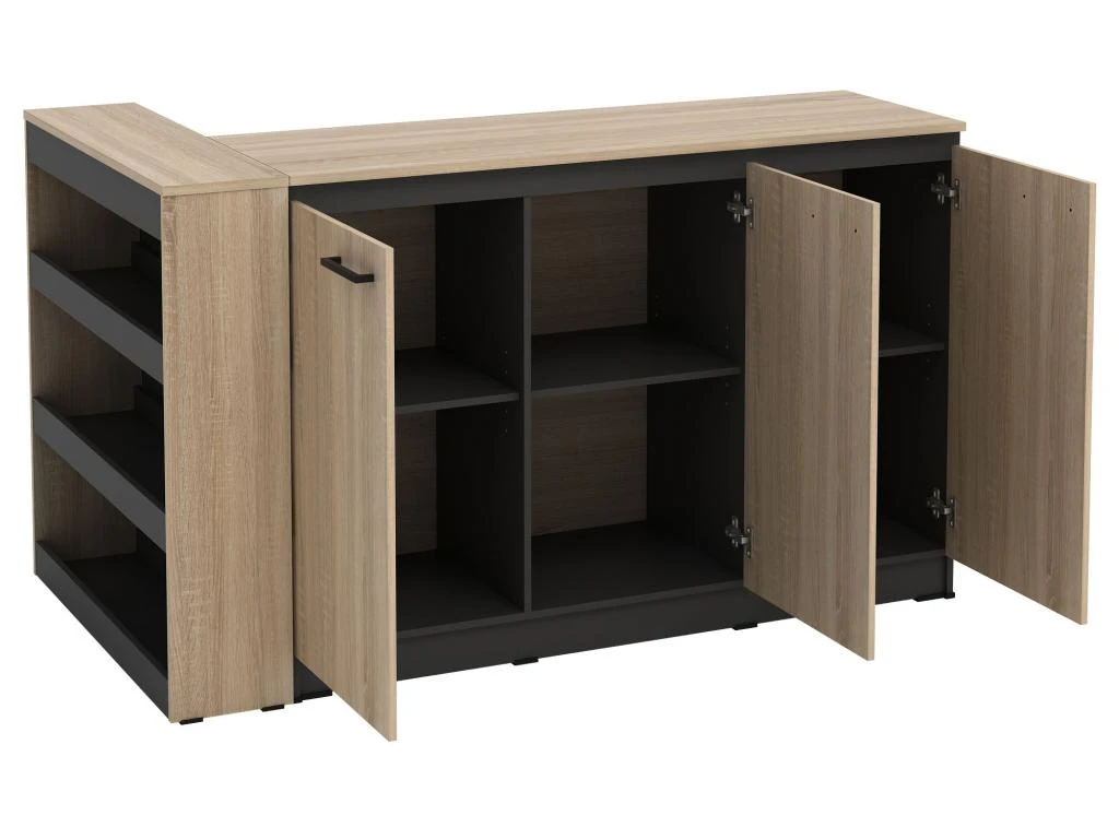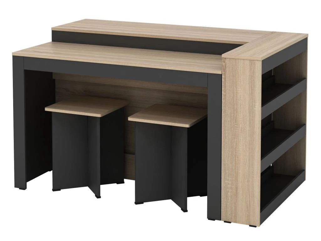 L’îlot central de cuisine NUSICE est le parfait équilibre entre fonctionnalité et convivialité. En effet, vous pourrez y cuisiner vos meilleurs plats tout en ayant le nécessaire à proximité, rangé derrière ses 3 portes ou sur ses étagères latérales. Et vous pourrez aussi y partager des moments avec vos proches grâce aux 2 tabourets assortis ! Enfin, son style contemporain et sobre saura parfaitement se fondre dans votre cuisine.