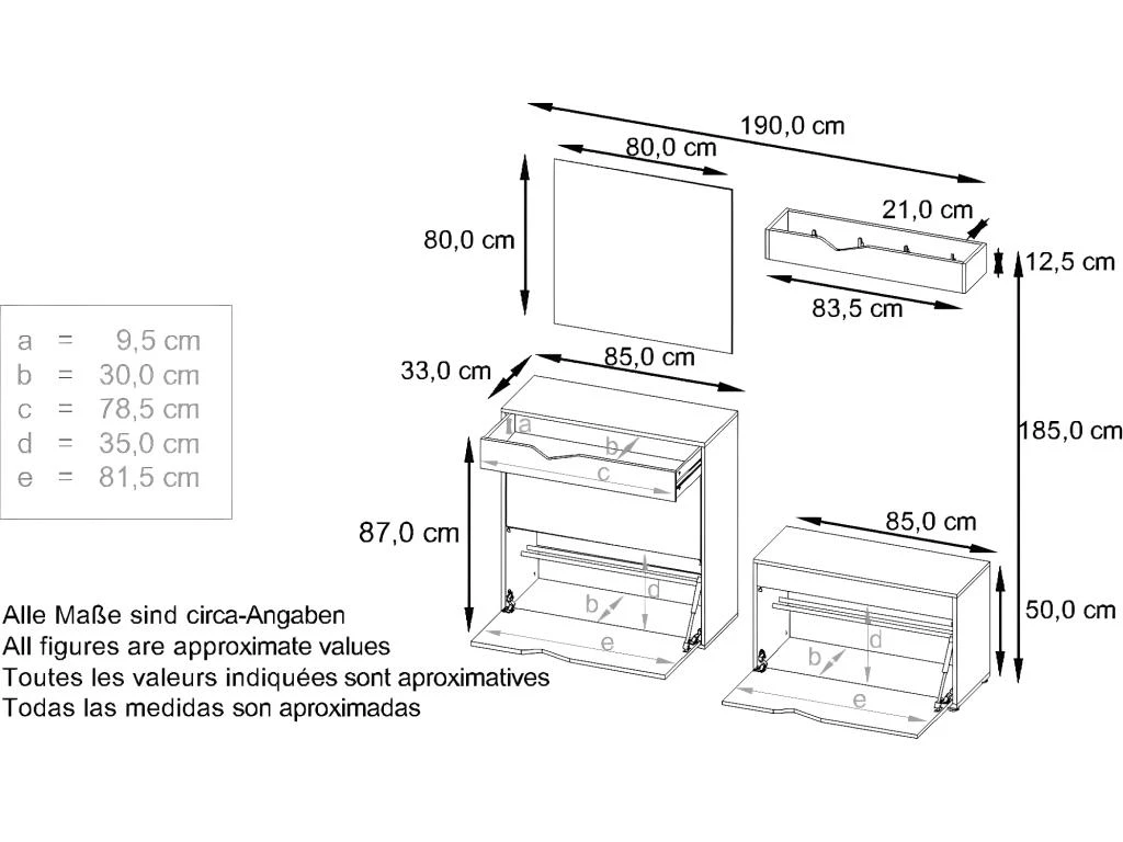 Dimensions de l’ensemble de l’armoire en cm environ (LxHxP) : 190 x 185 x 33