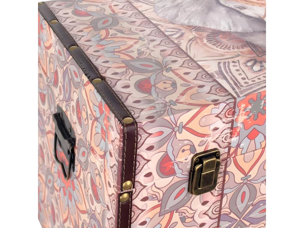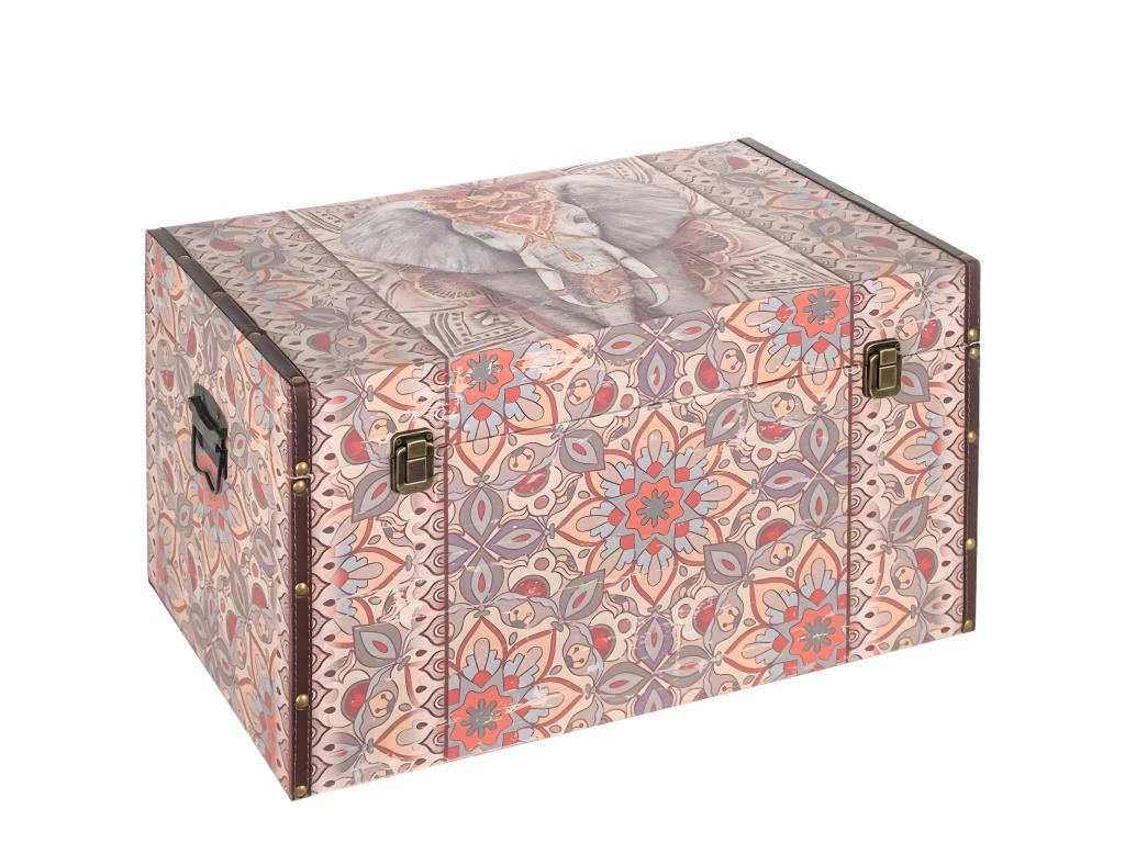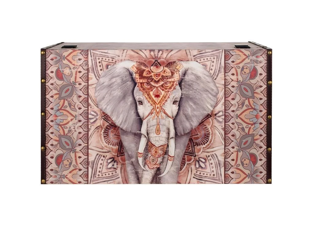 Grand Coffre de rangement Éléphant Ethnique 70 cm Structure en MDF recouverte de polyuréthane Dimensions : Hauteur 39 cm – Largeur 70 cm – Profondeur 41 cm