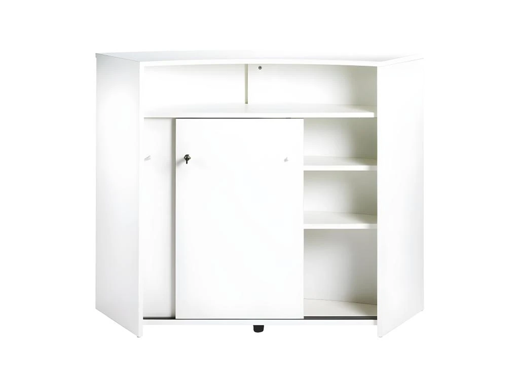 Le revers du meuble offre une grande niche ouverte et un espace de rangement accessible par 2 portes coulissantes munies d’une fermeture à clef, 3 niveaux de pose sont disponibles à l’intérieur