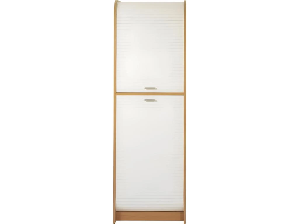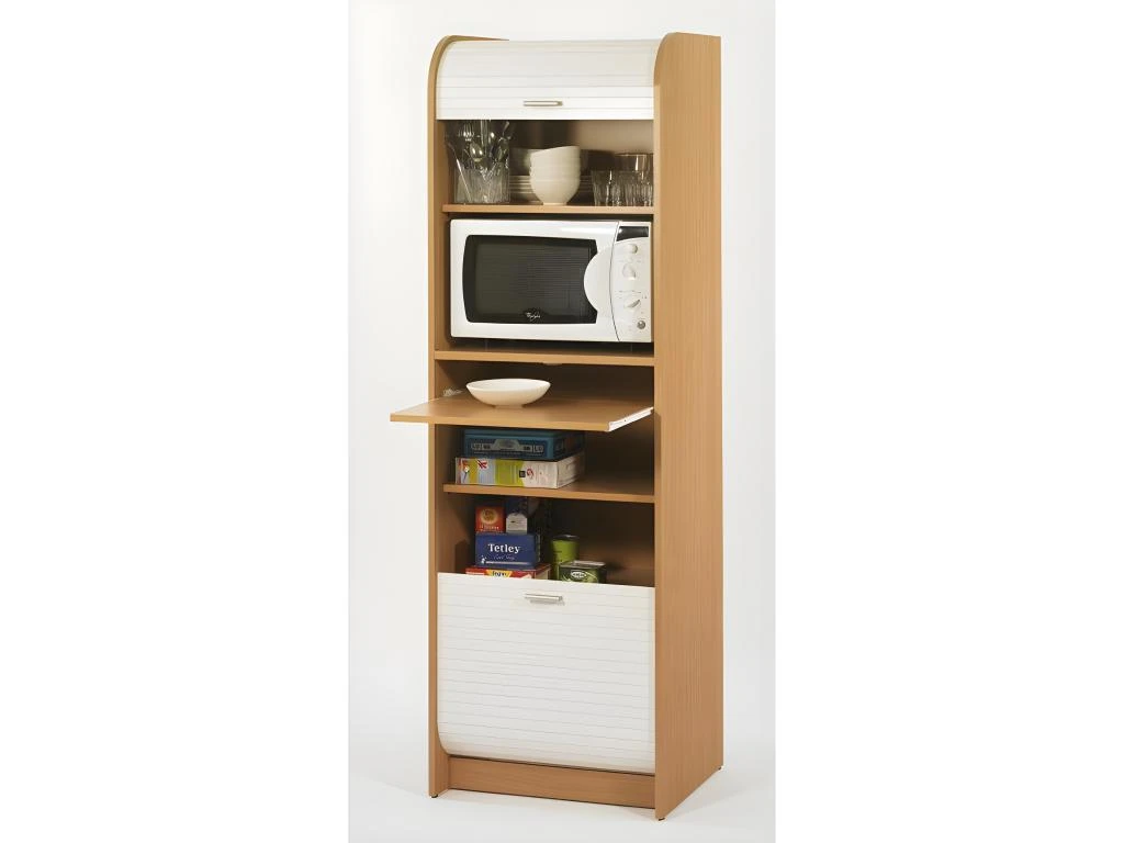 Grand Meuble Micro-onde fermé par deux rideaux. Hêtre et Rideaux blancs