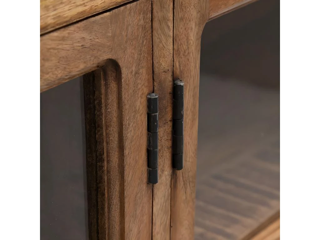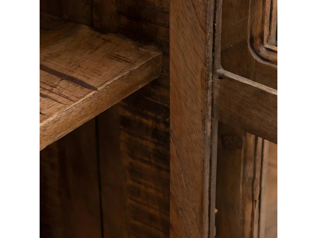Structure et cadre portes en manguier massif. Façades portes en verre transparent. Charge maximale supportée : 25kg par étagère.