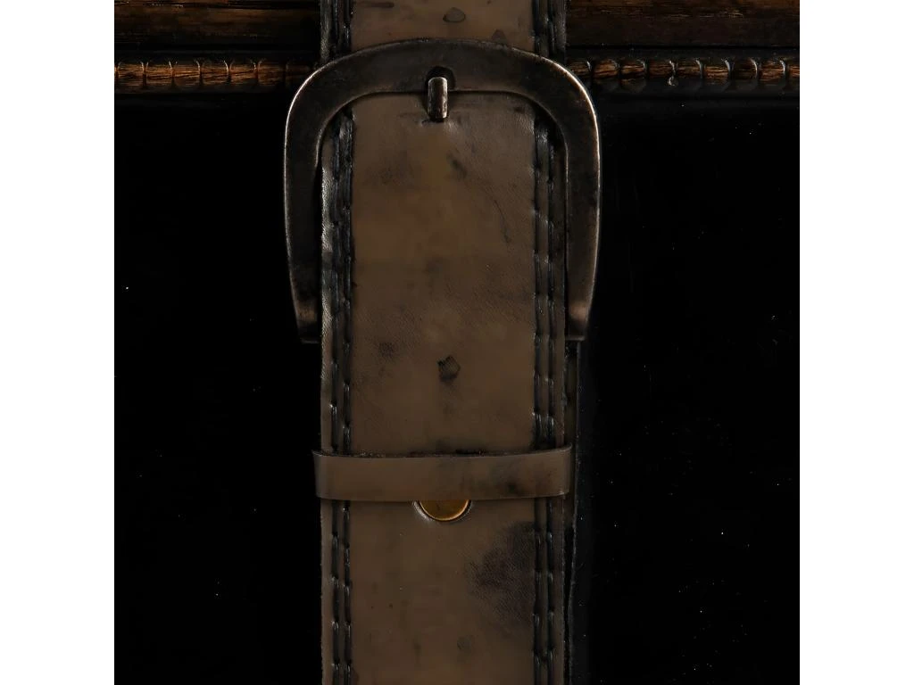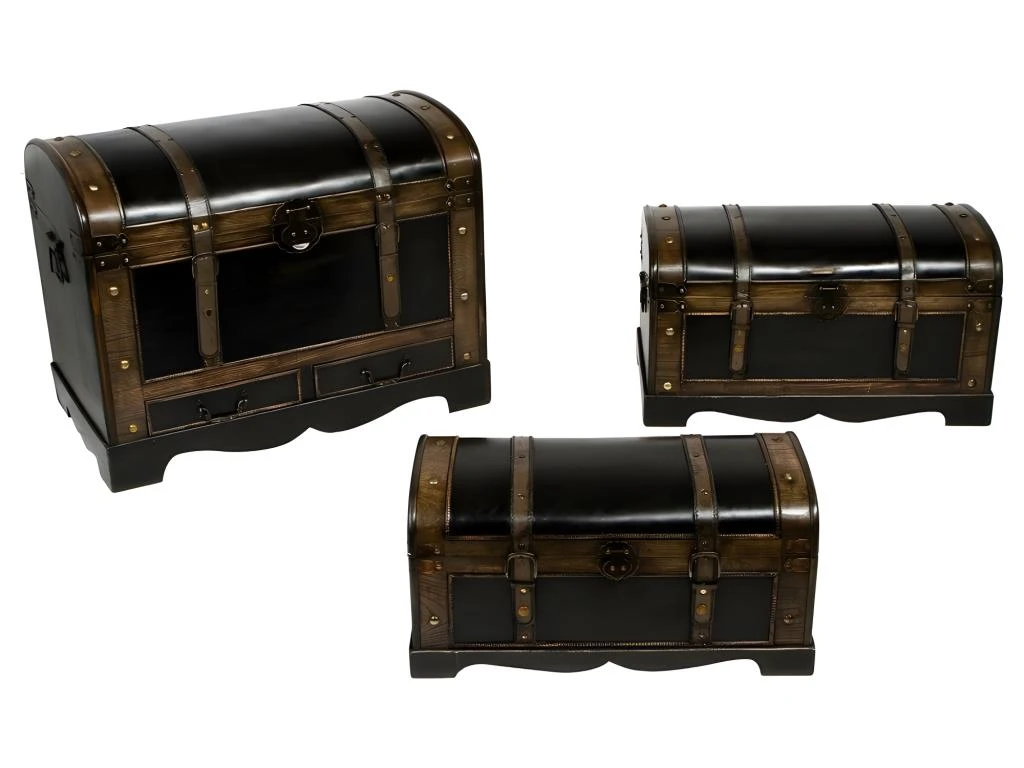 Lot de 3 malles British de marque Atmosphera. Superbes malles en bois, fermetures par crochets en métal, équipées de sangles façon cuir. Pour ranger et offrir un style éternel à votre intérieur. La grande malle a 2 tiroirs dans le bas. Dimensions des malles 76x47xH58 cm, 66x36xH36 cm et 56x27xJ27 cm. Poignées latérales. En bois massif, métal (fer) et plastique. Coloris noir et naturel foncé. poids 18 kg.