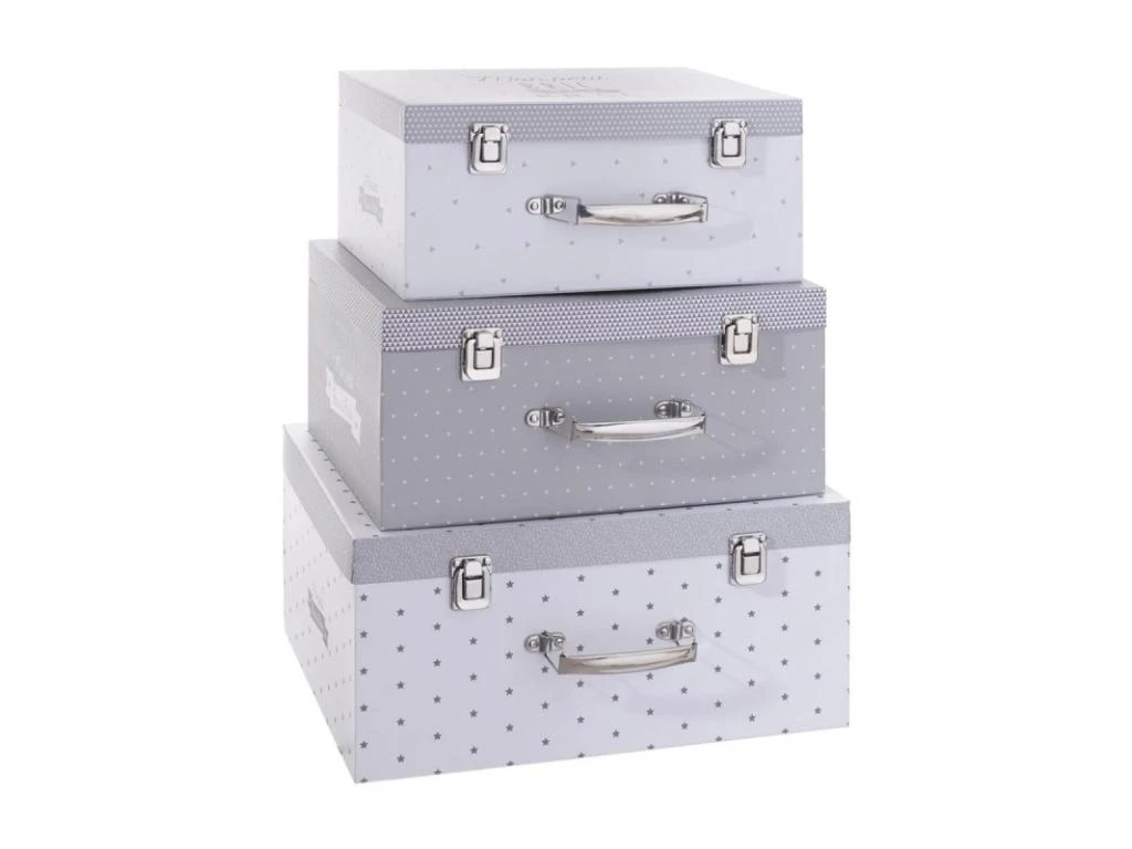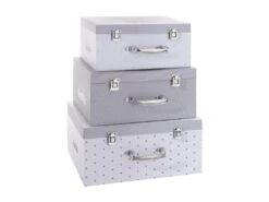Lot de 3 boites en carton. Elles se déclinent en gris ou en rose. Dimensions : S : L. 30 x l. 22 x H. 14 cm / M : L. 33 x l. 25 x H. 15,5 cm / L : L. 36 x l. 28 x 17 cm. Matière de la boite : Carton. Matière du poignée : Métal. Pliable : Non. Poids : 2,05 kg