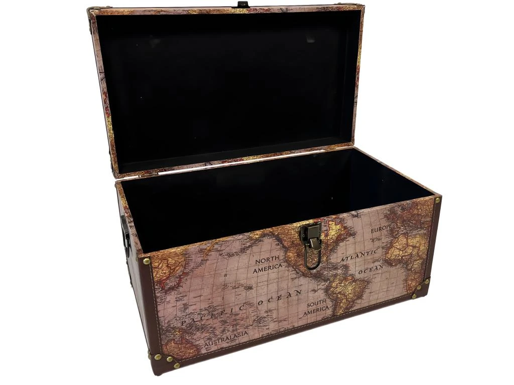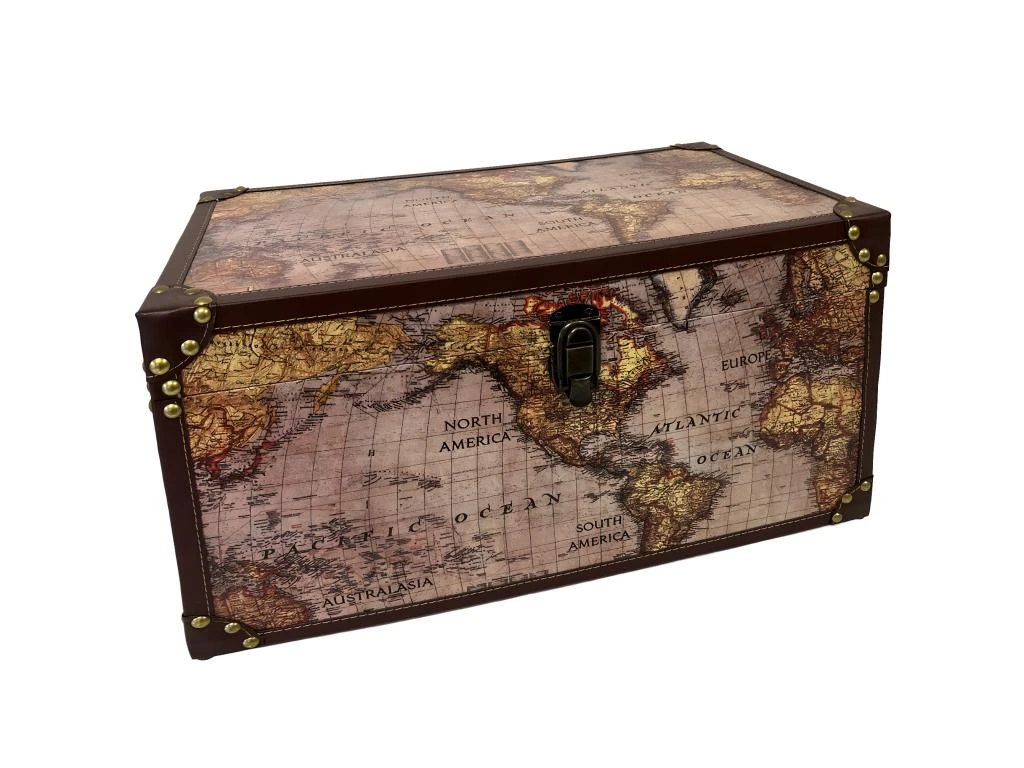 Lot de 3 malles Mappemonde Dessus en Polyuréthane aspect cuir Structure en bois Le couvercle est à charnières et les poignées et loquets sont en métal vieilli Dimensions du grand modèle : Longueur 59 cm x Profondeur 36 cm x Hauteur 33 cm Dimensions du modèle médium : Longueur 49 cm x Profondeur 28 cm x Hauteur 25 cm Dimensions du petit modèle : Longueur 35 cm x Profondeur 21 cm x Hauteur 19 cm