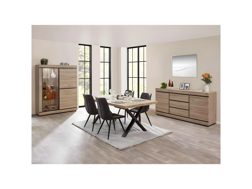 Structure en panneau de particules, finition papier décor chêne français. Portes et tiroirs avec systeme de fermeture Softclose. Pieds en plastique noir.