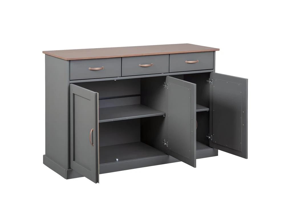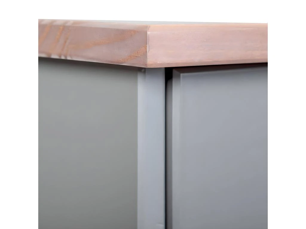 Structure en pin massif, finition vernis gris. Poignées en métal cuivré. Tiroirs sur rails. Vitrine en panneau de particules mélaminé. Porte en verre sécurit.