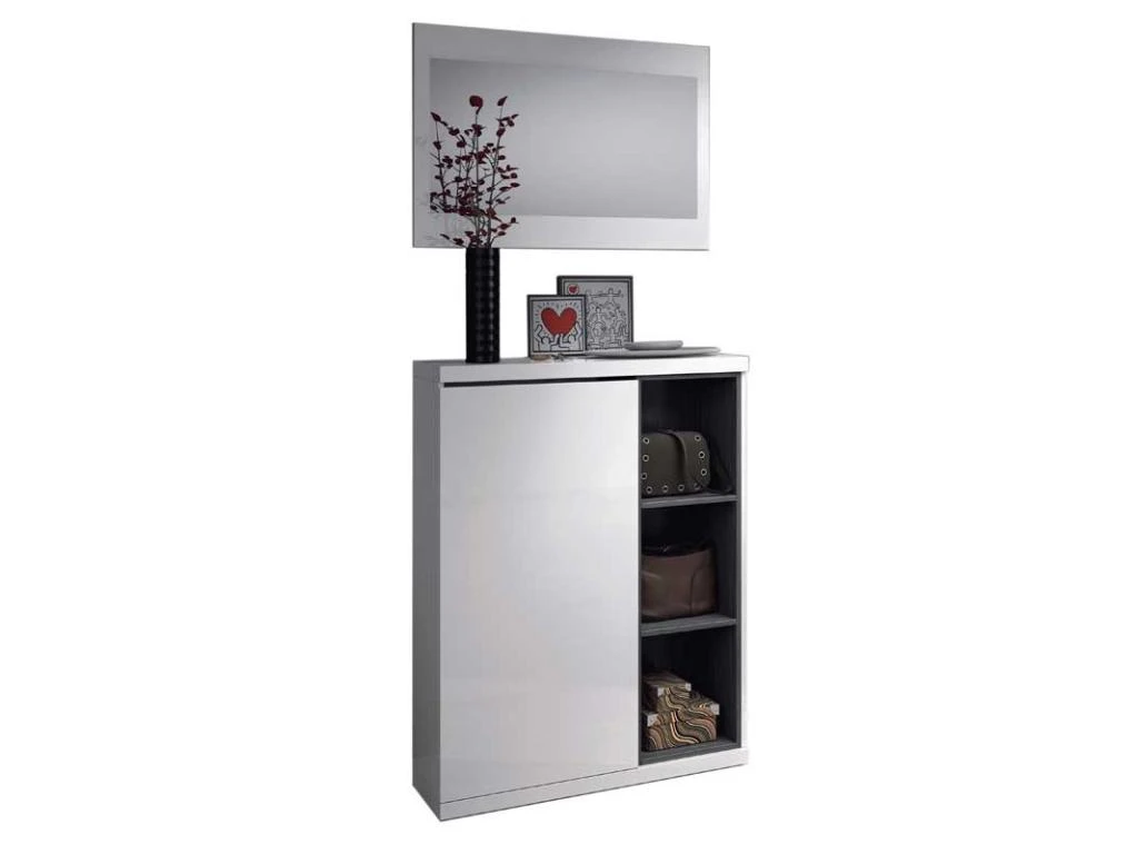 Meuble à chaussures environ 9 paires avec une porte et un miroir Dimensions: L 79 x l 25 x H 108 cm Matière: Panneaux de particules mélaminés – Tiges en aluminium – Charnières métalliques Teinte Gris anthracite – Blanc brillant Niche de rangement non réversible – Tiges pour le support des chaussures Quincaillerie pour la fixation au mur incluse – Miroir horizontal ou vertical Poids supporté par le meuble 15 Kg Assemblage: Livré démonté – 1 colis – 31.5 Kg Fabrication: espagne