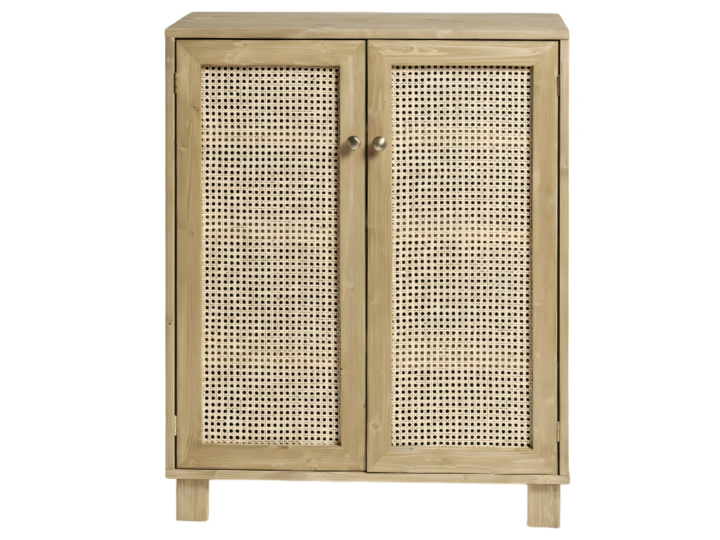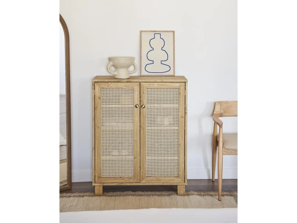 Buffet en bois avec portes en rotin, fabriqué artisanalement.