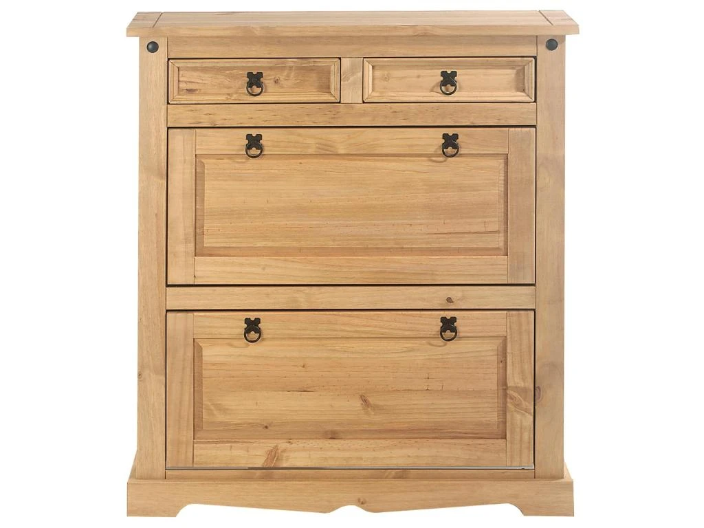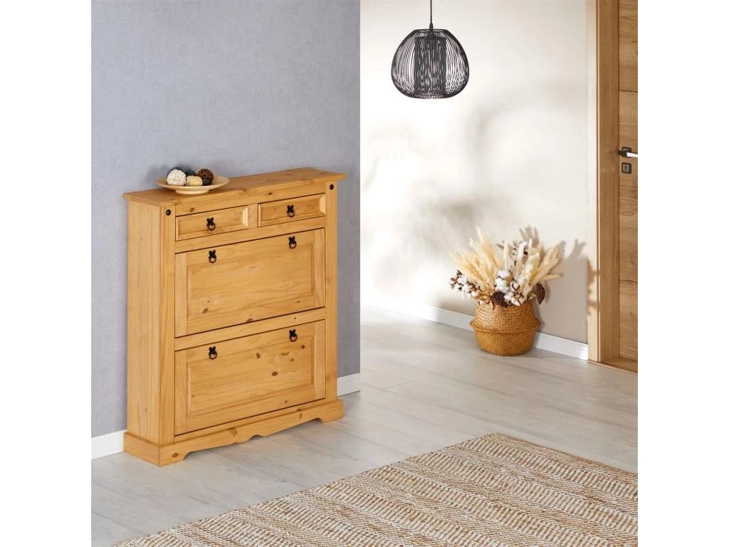 … avec son design authentique apportera beaucoup de charme à votre entrée. Les abattants sont équipés d’une séparation intérieure pour vous permettre d’y ranger plus de chaussures, et les tiroirs sont idéalement placés pour y déposer vos clefs et autres petits objets du quotidien. Les ferroneries noires complètent le design de ce meuble rustique et fonctionnel. Ce meuble de rangement en bois massif trouvera facilement sa place dans votre intérieur quel que soit votre décoration, n’hésitez pas à compléter votre mobilier avec les autres meubles de la gamme TEQUILA !