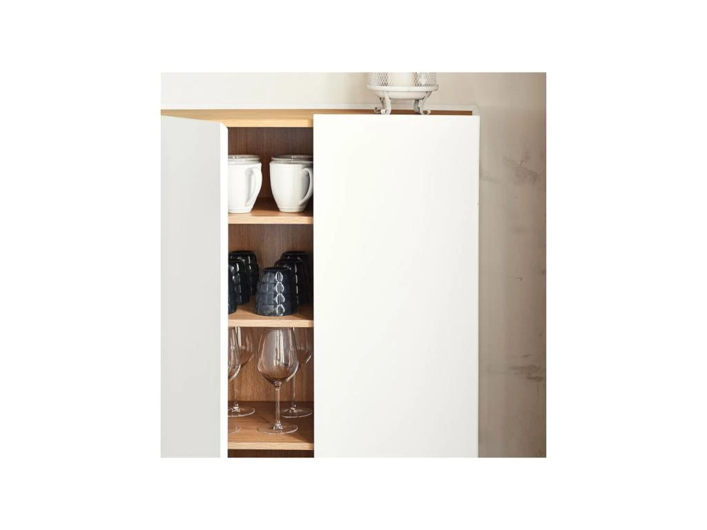 Les portes longilignes rythment la façade et s’ouvrent sur un intérieur assorti au plateau, multiples surfaces de pose et rack range bouteilles sont mis à disposition.