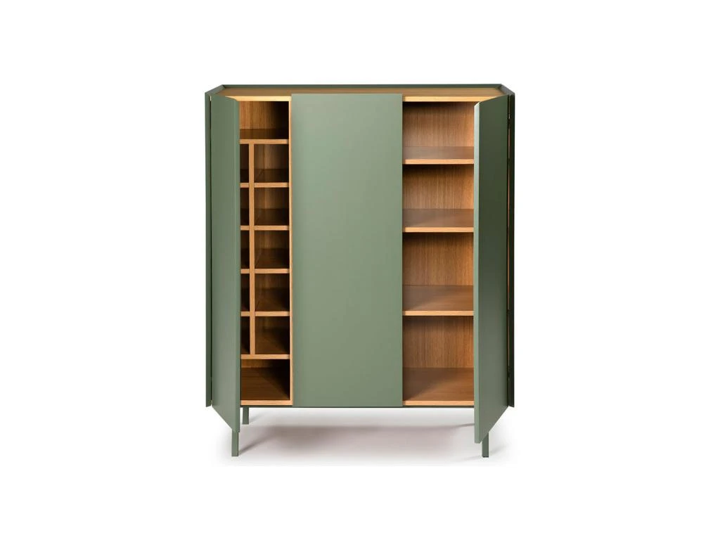 Les portes longilignes rythment la façade et s’ouvrent sur un intérieur assorti au plateau, multiples surfaces de pose et rack range bouteilles sont mis à disposition.